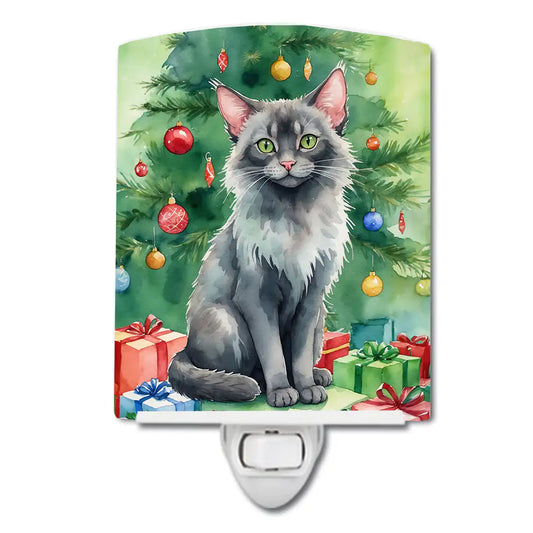 Nebelung Cat By the Christmas Tree Ceramic Night Light