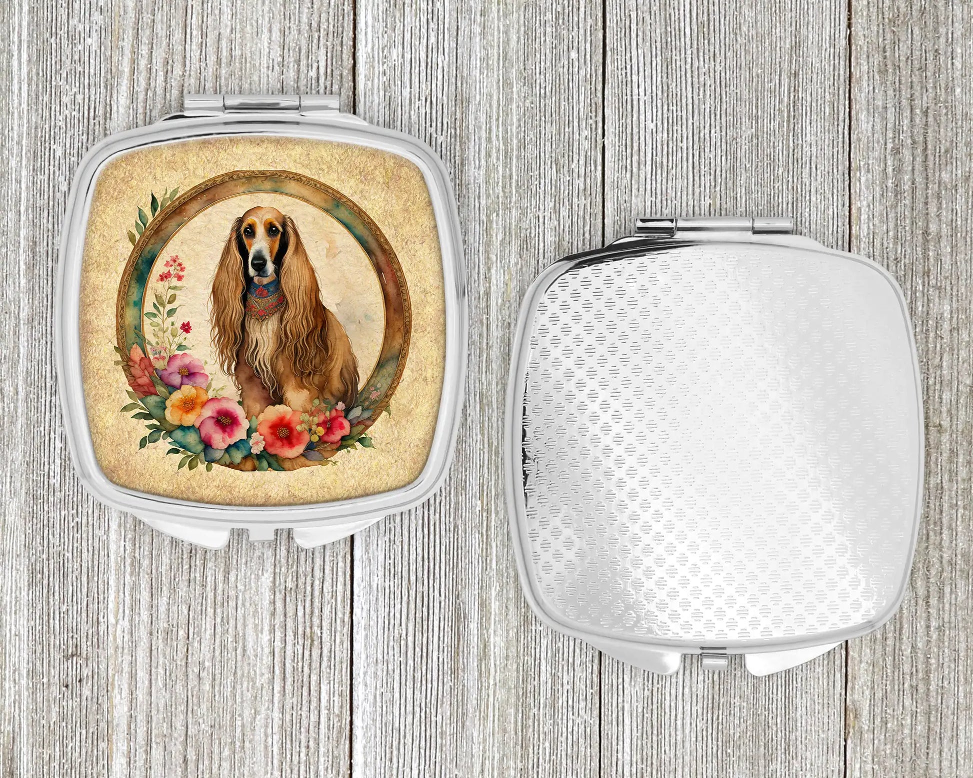 Compact Mirror featuring breed specific Afghan Hound artwork. Introducing our Square Compact Mirror, a blend of elegance, functionality, and compactness, perfect for on-the-go touch-ups. This Silvertone metal mirror, with dimensions of 2.75 inches x 3 inches x .3 inches, fits effortlessly into your purse, handbag, or pocket, ensuring that you can check your appearance anytime, anywhere. Our compact mirror stands out with its eye-catching artwork on the front, adding a dash of style to this practical accessory. It is more than just a mirror; it's a statement piece that reflects your personality and aesthetic. When opened, this compact reveals two mirrors inside, doubling your perspective for precise touch-ups. The Silvertone metal construction ensures durability while maintaining a lightweight feel, making it an ideal everyday carry item. Whether you're rushing to a meeting, prepping for a dinner date, or just need a quick check on your look, our Square Compact Mirror is your reliable companion. Experience the perfect blend of style and practicality with this must-have accessory.