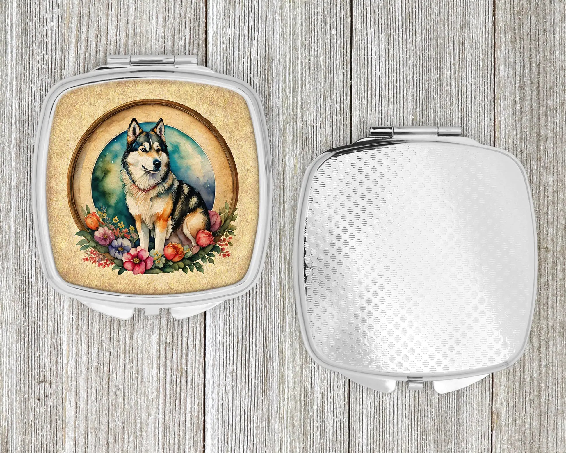 Compact Mirror featuring breed specific Alaskan Malamute artwork. Introducing our Square Compact Mirror, a blend of elegance, functionality, and compactness, perfect for on-the-go touch-ups. This Silvertone metal mirror, with dimensions of 2.75 inches x 3 inches x .3 inches, fits effortlessly into your purse, handbag, or pocket, ensuring that you can check your appearance anytime, anywhere. Our compact mirror stands out with its eye-catching artwork on the front, adding a dash of style to this practical accessory. It is more than just a mirror; it's a statement piece that reflects your personality and aesthetic. When opened, this compact reveals two mirrors inside, doubling your perspective for precise touch-ups. The Silvertone metal construction ensures durability while maintaining a lightweight feel, making it an ideal everyday carry item. Whether you're rushing to a meeting, prepping for a dinner date, or just need a quick check on your look, our Square Compact Mirror is your reliable companion. Experience the perfect blend of style and practicality with this must-have accessory.