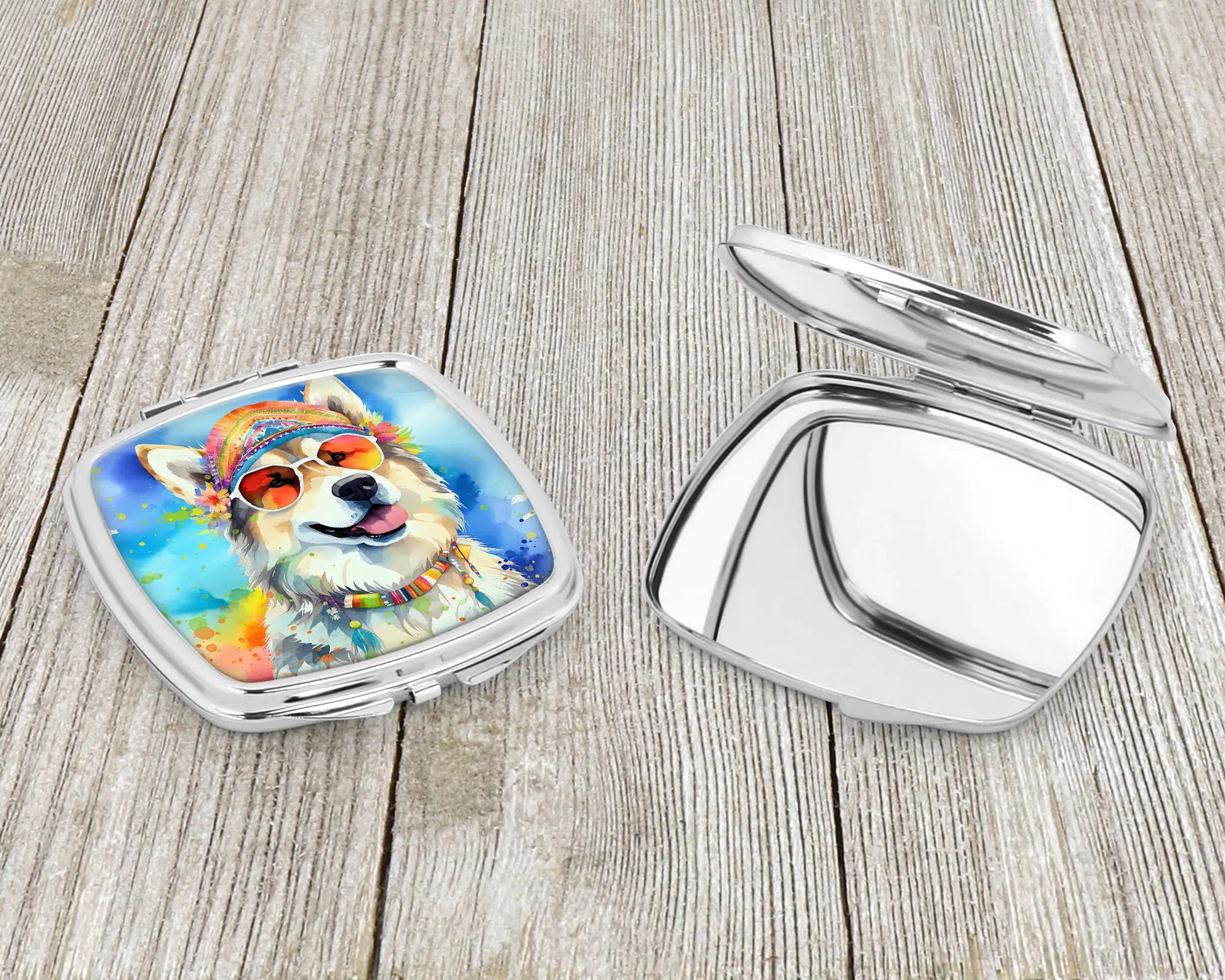 Compact Mirror featuring breed specific Alaskan Malamute artwork. Introducing our Square Compact Mirror, a blend of elegance, functionality, and compactness, perfect for on-the-go touch-ups. This Silvertone metal mirror, with dimensions of 2.75 inches x 3 inches x .3 inches, fits effortlessly into your purse, handbag, or pocket, ensuring that you can check your appearance anytime, anywhere. Our compact mirror stands out with its eye-catching artwork on the front, adding a dash of style to this practical accessory. It is more than just a mirror; it's a statement piece that reflects your personality and aesthetic. When opened, this compact reveals two mirrors inside, doubling your perspective for precise touch-ups. The Silvertone metal construction ensures durability while maintaining a lightweight feel, making it an ideal everyday carry item. Whether you're rushing to a meeting, prepping for a dinner date, or just need a quick check on your look, our Square Compact Mirror is your reliable companion. Experience the perfect blend of style and practicality with this must-have accessory.