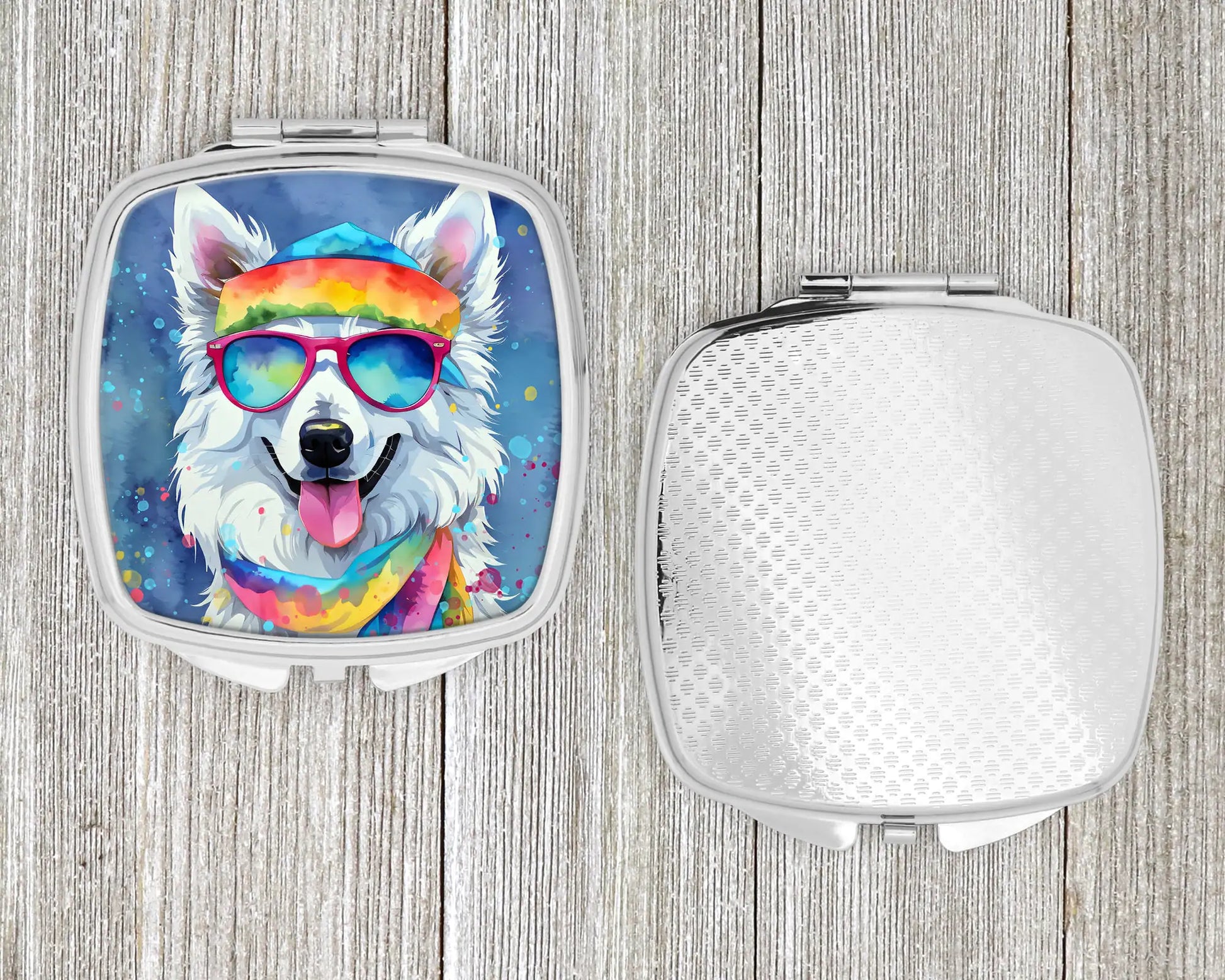 Compact Mirror featuring breed specific American Eskimo artwork. Introducing our Square Compact Mirror, a blend of elegance, functionality, and compactness, perfect for on-the-go touch-ups. This Silvertone metal mirror, with dimensions of 2.75 inches x 3 inches x .3 inches, fits effortlessly into your purse, handbag, or pocket, ensuring that you can check your appearance anytime, anywhere. Our compact mirror stands out with its eye-catching artwork on the front, adding a dash of style to this practical accessory. It is more than just a mirror; it's a statement piece that reflects your personality and aesthetic. When opened, this compact reveals two mirrors inside, doubling your perspective for precise touch-ups. The Silvertone metal construction ensures durability while maintaining a lightweight feel, making it an ideal everyday carry item. Whether you're rushing to a meeting, prepping for a dinner date, or just need a quick check on your look, our Square Compact Mirror is your reliable companion. Experience the perfect blend of style and practicality with this must-have accessory.
