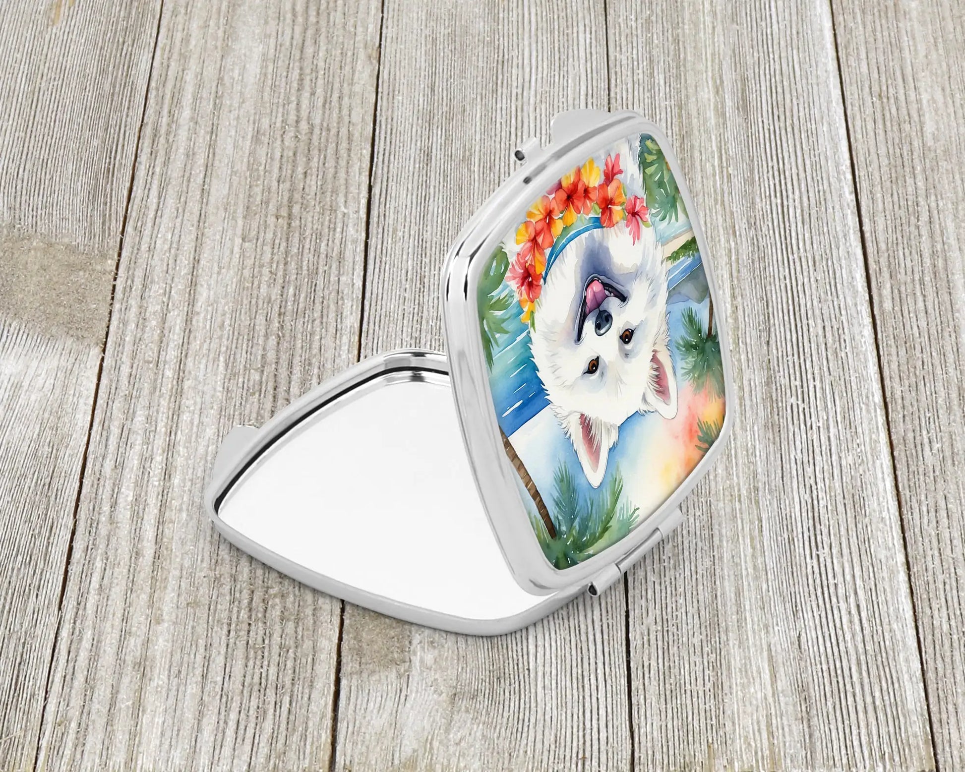 Compact Mirror featuring breed specific American Eskimo artwork. Introducing our Square Compact Mirror, a blend of elegance, functionality, and compactness, perfect for on-the-go touch-ups. This Silvertone metal mirror, with dimensions of 2.75 inches x 3 inches x .3 inches, fits effortlessly into your purse, handbag, or pocket, ensuring that you can check your appearance anytime, anywhere. Our compact mirror stands out with its eye-catching artwork on the front, adding a dash of style to this practical accessory. It is more than just a mirror; it's a statement piece that reflects your personality and aesthetic. When opened, this compact reveals two mirrors inside, doubling your perspective for precise touch-ups. The Silvertone metal construction ensures durability while maintaining a lightweight feel, making it an ideal everyday carry item. Whether you're rushing to a meeting, prepping for a dinner date, or just need a quick check on your look, our Square Compact Mirror is your reliable companion. Experience the perfect blend of style and practicality with this must-have accessory.