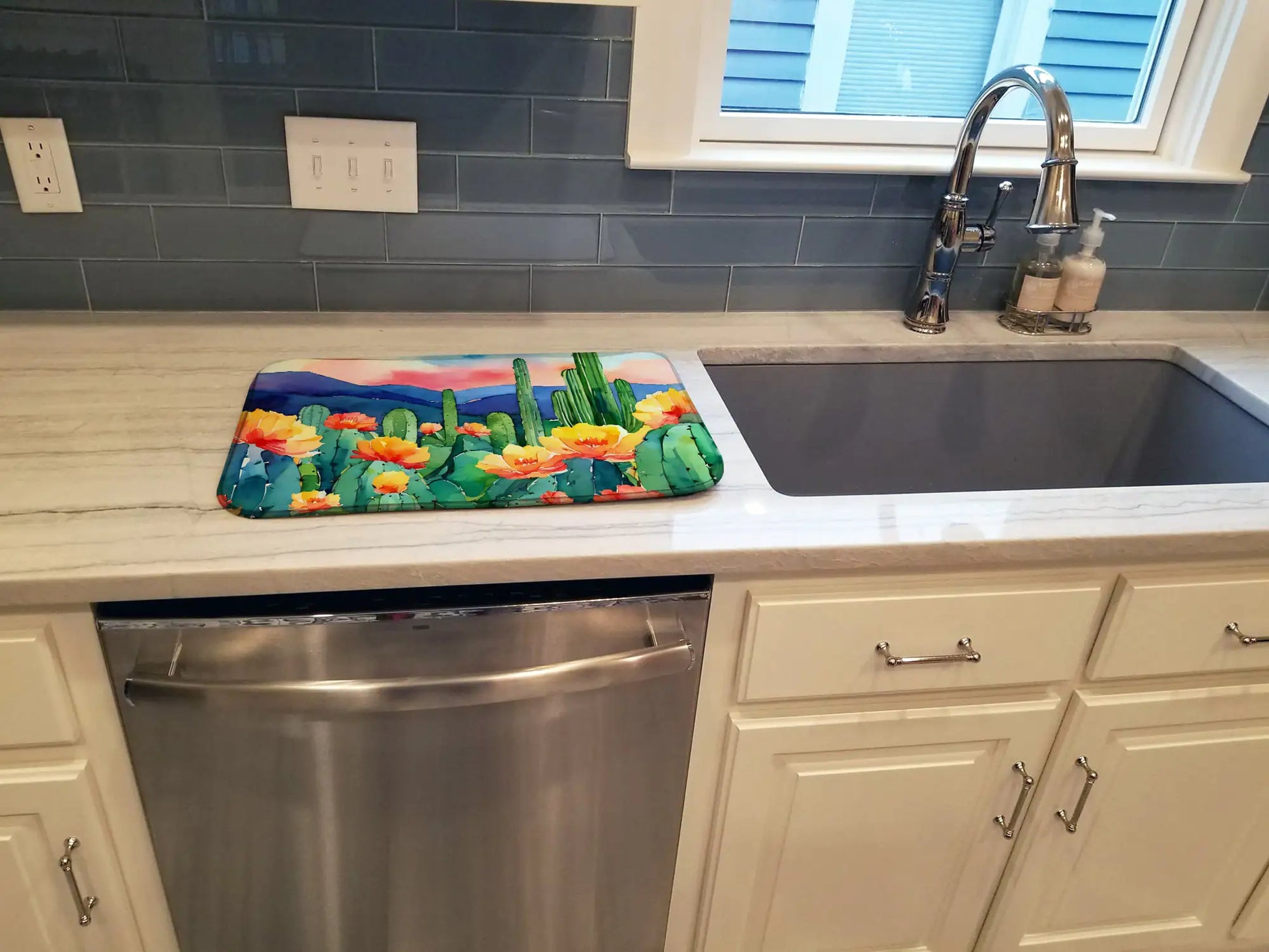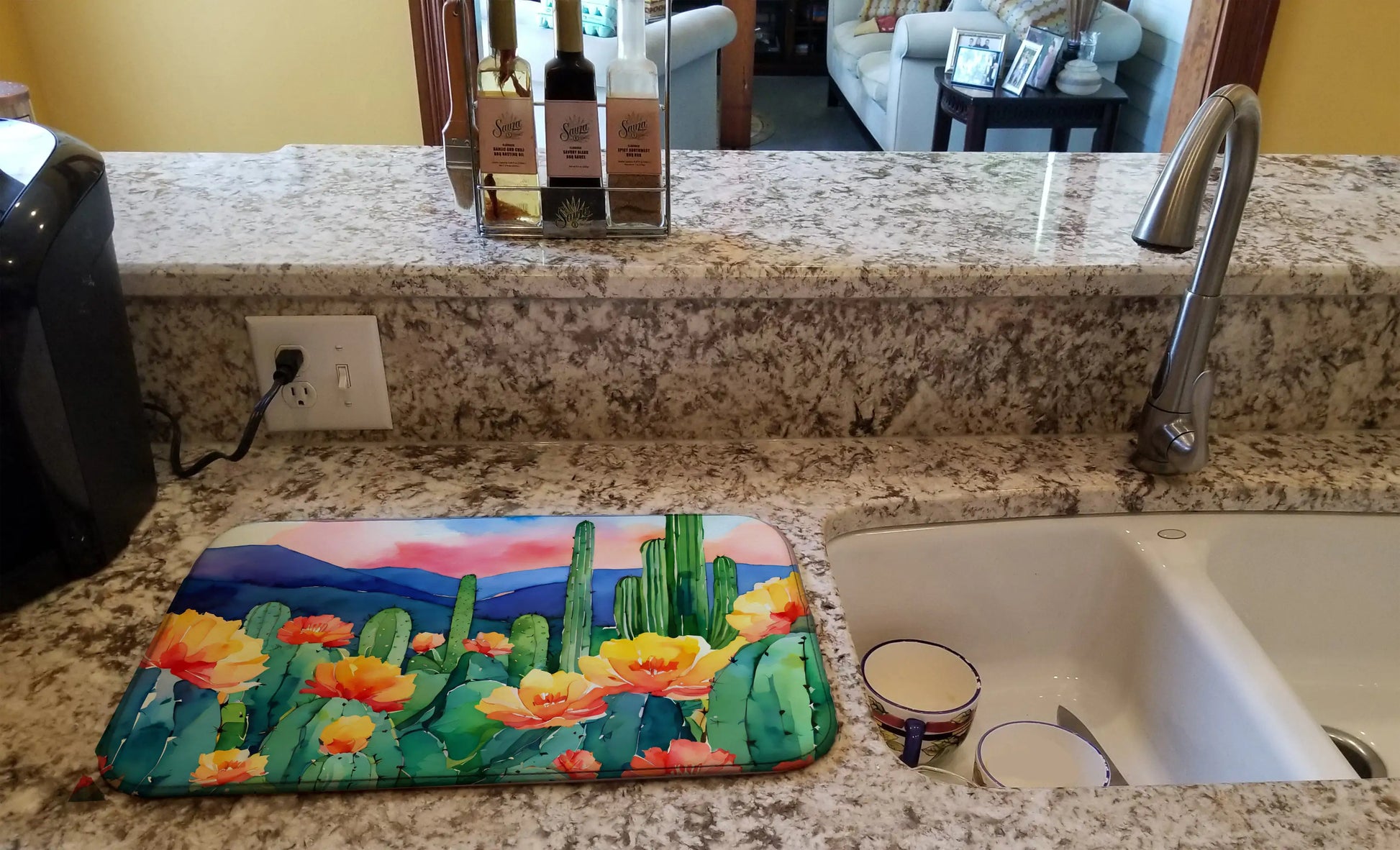 Dish Drying Mat featuring breed specific Arizona Saguaro Cactus Blossom artwork. Say goodbye to messy countertops and soggy dish towels with our innovative dish drying mat. Our high-quality dish drying pad is designed to keep your countertops dry while offering a stylish and efficient solution. Whether you're air drying dishes, glasses, stemware, silverware, pots, pans, bottles, or even fruits and vegetables, our dish mat is the perfect choice. The 14 inches x 22 inches size fits most counters and dish drying racks, and the non-slip design ensures stability. Made with water-absorbent polyester and a polyurethane foam insert, our dish drying mat is not only functional but also durable. It's machine washable and printed in the USA for long-lasting use. The beautiful artwork adds flair to your kitchen decor, making it a perfect housewarming gift or present for any occasion. Upgrade your kitchen experience with our absorbent and versatile dish drying mat.