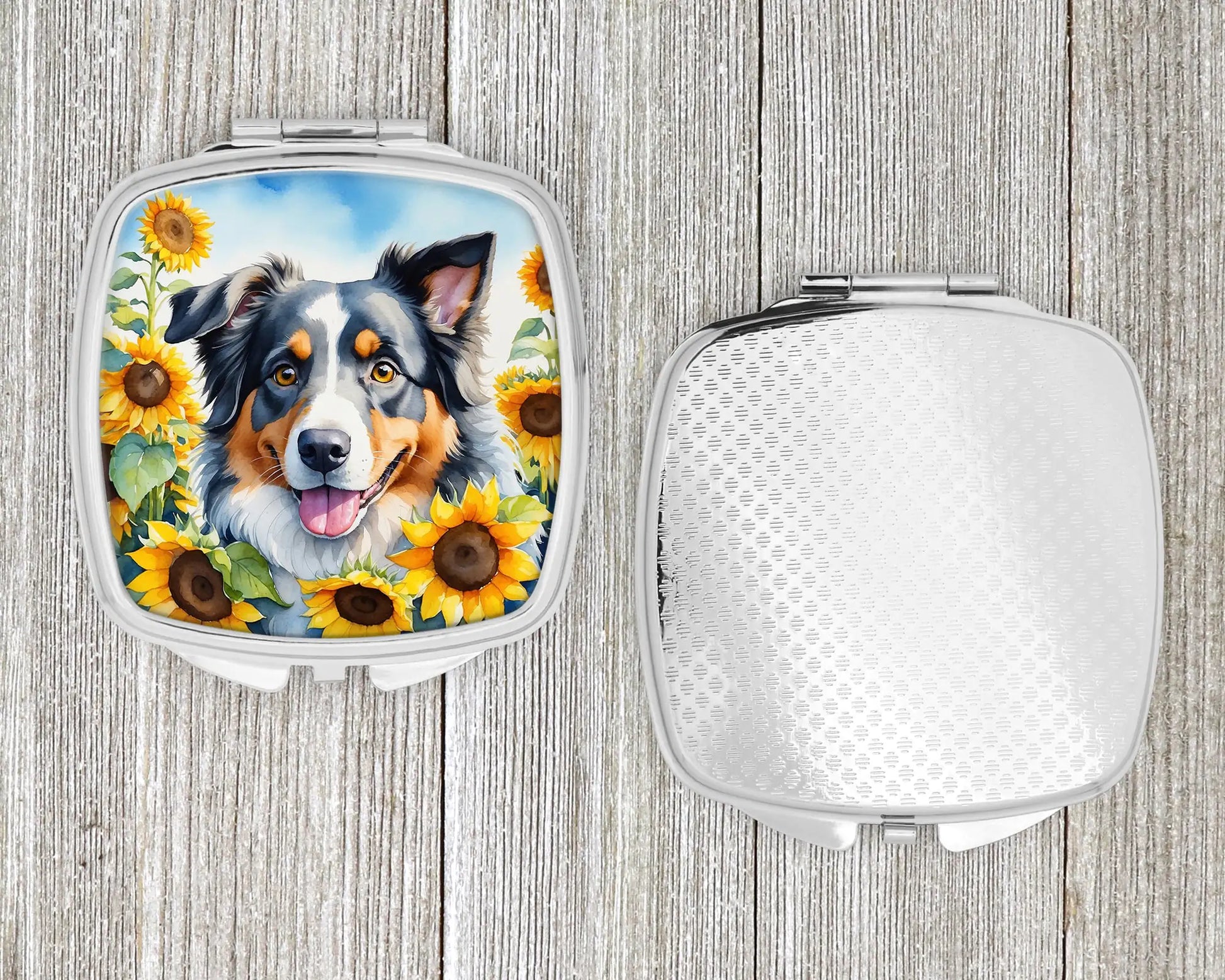 Compact Mirror featuring breed specific Australian Shepherd artwork. Introducing our Square Compact Mirror, a blend of elegance, functionality, and compactness, perfect for on-the-go touch-ups. This Silvertone metal mirror, with dimensions of 2.75 inches x 3 inches x .3 inches, fits effortlessly into your purse, handbag, or pocket, ensuring that you can check your appearance anytime, anywhere. Our compact mirror stands out with its eye-catching artwork on the front, adding a dash of style to this practical accessory. It is more than just a mirror; it's a statement piece that reflects your personality and aesthetic. When opened, this compact reveals two mirrors inside, doubling your perspective for precise touch-ups. The Silvertone metal construction ensures durability while maintaining a lightweight feel, making it an ideal everyday carry item. Whether you're rushing to a meeting, prepping for a dinner date, or just need a quick check on your look, our Square Compact Mirror is your reliable companion. Experience the perfect blend of style and practicality with this must-have accessory.