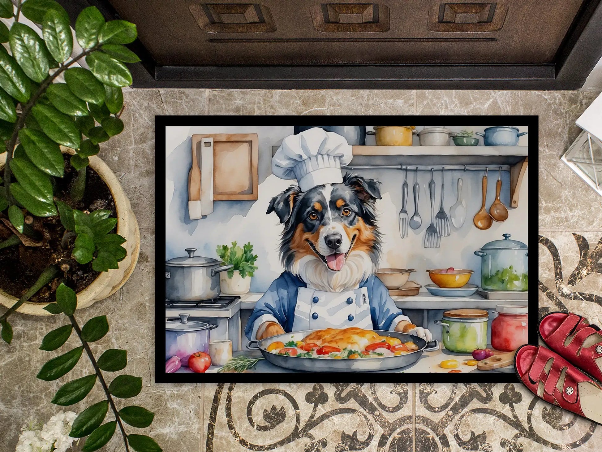 Doormat featuring breed specific Australian Shepherd artwork. Welcome your guests in style with our Artwork Door Mat, designed to withstand almost any weather condition. This mat, measuring approximately 18 by 27 inches, is held together by durable black binding tape. Its top layer, composed of polyester felt, is dyed with the eye-catching image you see on the mat. A few layers below provide the mat with stability, while its rubber bottom is stamped to help prevent slipping and ensures safety. Our mat works wonderfully as both an indoor or outdoor door mat. For cleaning, simply hose it off with water or use a power washer - no need for any cleaner that produces suds. Avoid scrubbing with a brush, instead, opt for the vacuum on floor setting. Designed manufactured and printed in the USA, this mat is a perfect addition to your porch, outdoor kitchen, entryway, or any indoor space. Its unique design makes it a charming decorative rug that greets your guests and adds a stylish touch to your home decor.