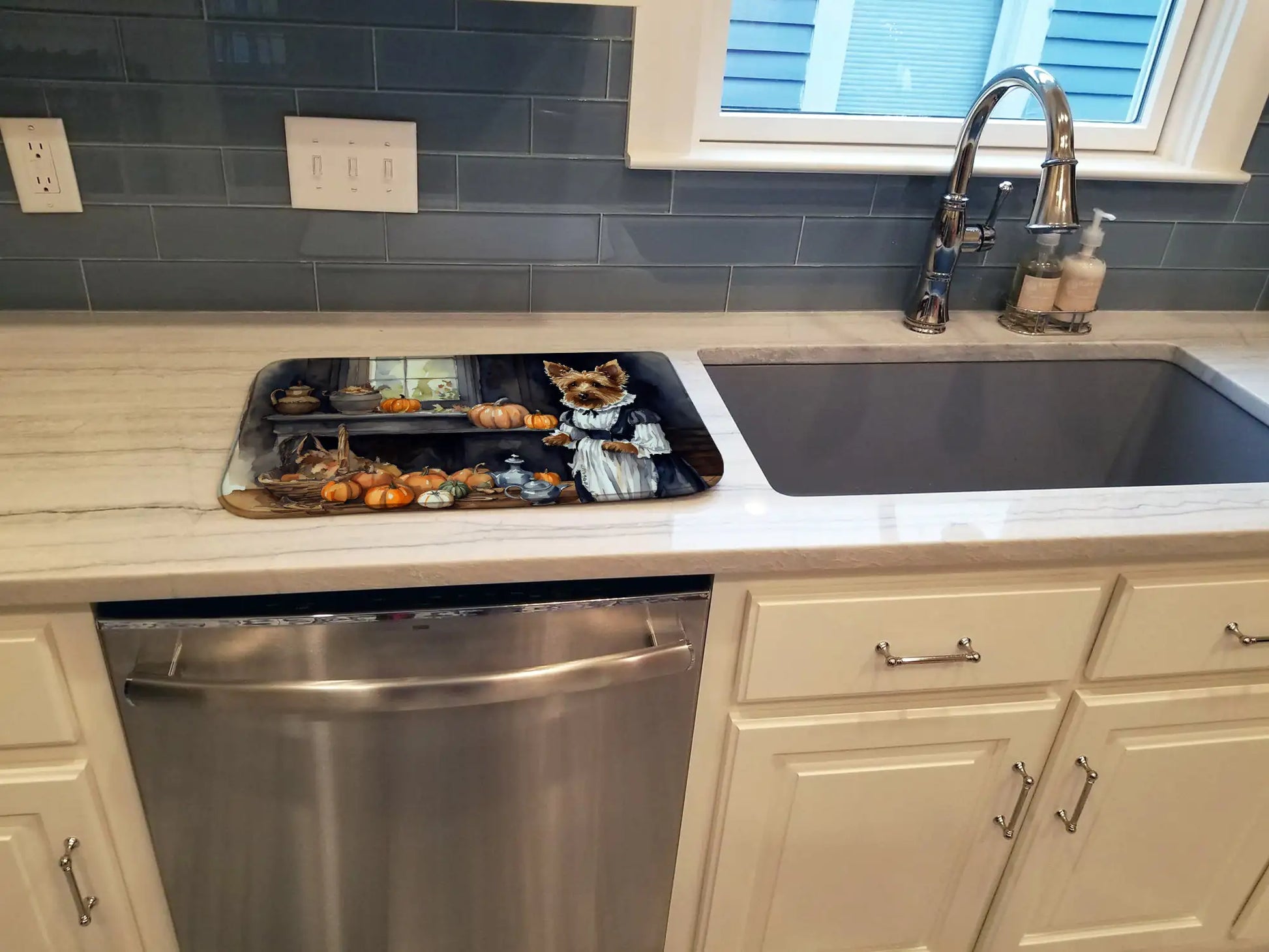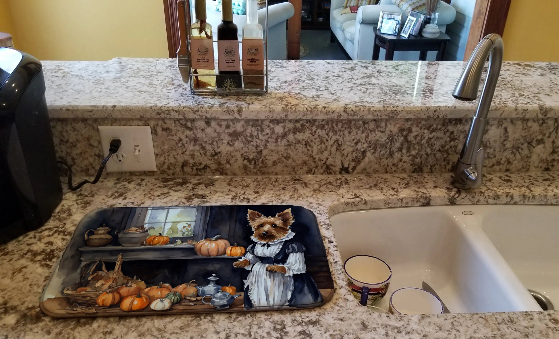 Dish Drying Mat featuring breed specific Australian Terrier artwork. Celebrate Halloween with this Halloween Dish Drying Mat. Say goodbye to messy countertops and soggy dish towels with our innovative dish drying mat. Our high-quality dish drying pad is designed to keep your countertops dry while offering a stylish and efficient solution. Whether you're air drying dishes, glasses, stemware, silverware, pots, pans, bottles, or even fruits and vegetables, our dish mat is the perfect choice. The 14 inches x 22 inches size fits most counters and dish drying racks, and the non-slip design ensures stability. Made with water-absorbent polyester and a polyurethane foam insert, our dish drying mat is not only functional but also durable. It's machine washable and printed in the USA for long-lasting use. The beautiful artwork adds flair to your kitchen decor, making it a perfect housewarming gift or present for any occasion. Upgrade your kitchen experience with our absorbent and versatile dish drying mat.