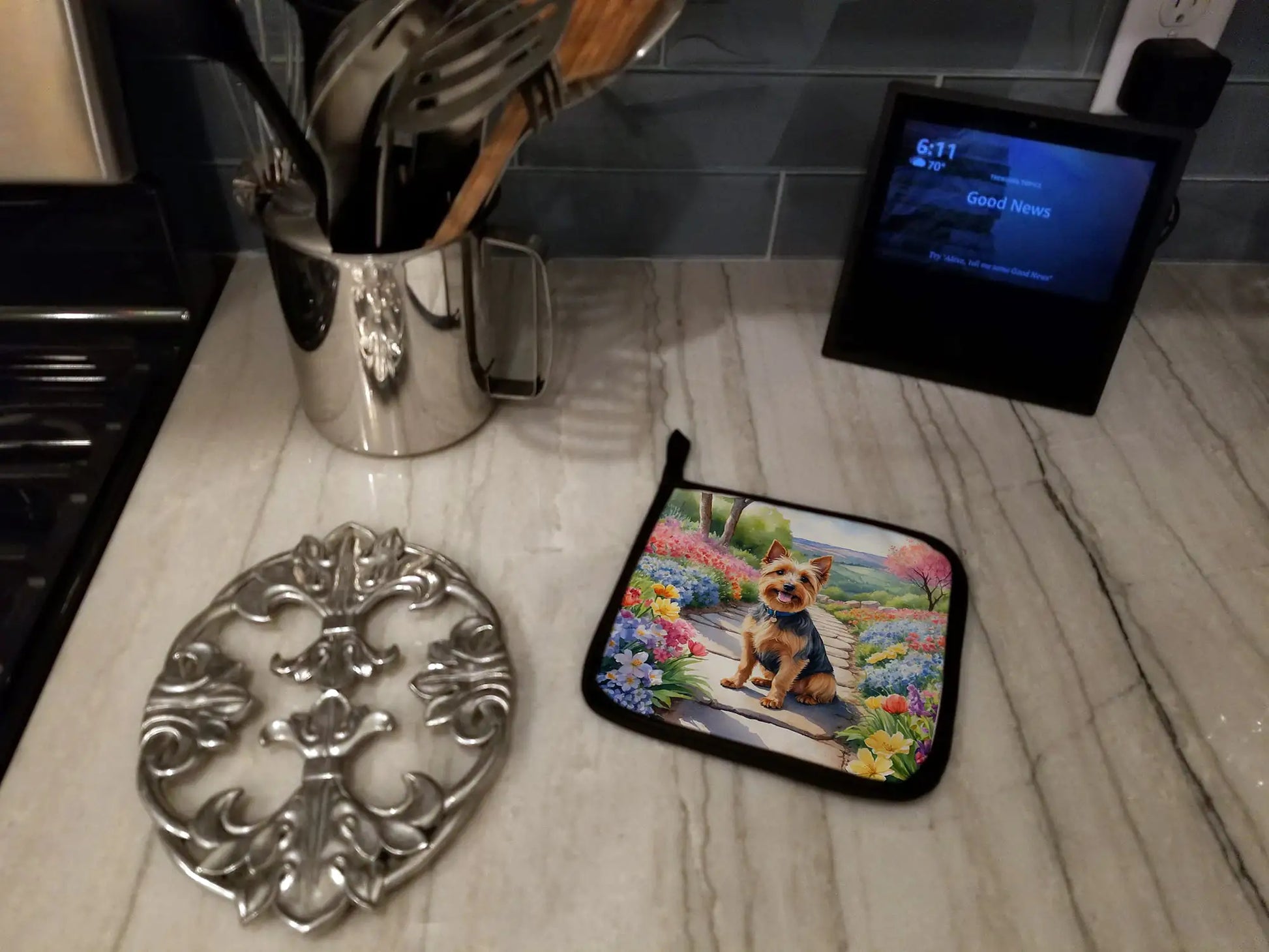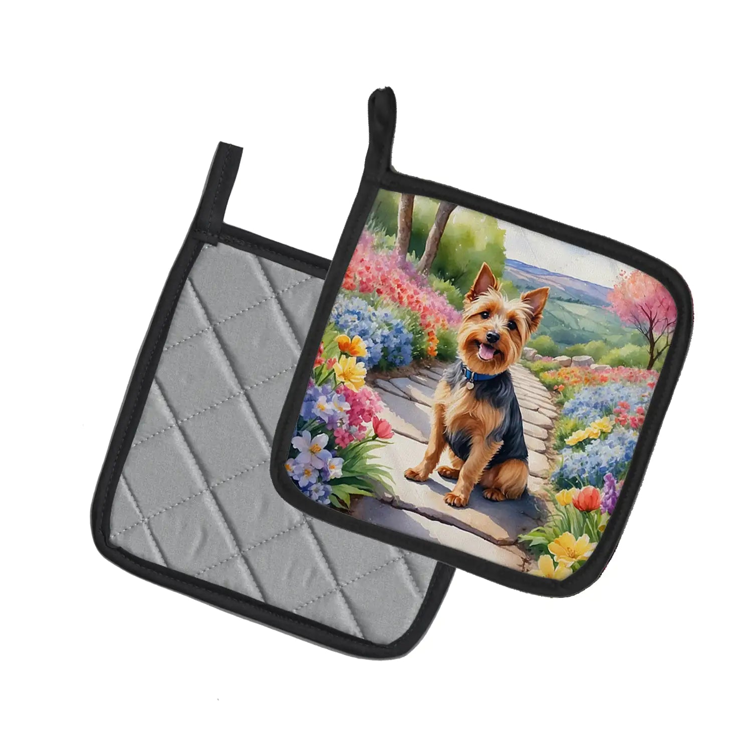 Pair of Pot Holders featuring breed specific Australian Terrier artwork. A Pair of Pot Holders to match your kitchen decor. Made in the USA these are thick and functional. Full color artwork decorates the front polyester fabric of the hot pad and accented by a black trim. Use these at as a trivet for your Thanksgiving or Christmas tablescape. Filled with insulated fabric and quilted for durability. These colorful pot holders will make a great gift for your favorite home cook or executive chef. Each pot holder measures approximately 7 1/2 inches by 7 1/2 inches. A hanging tab is included.