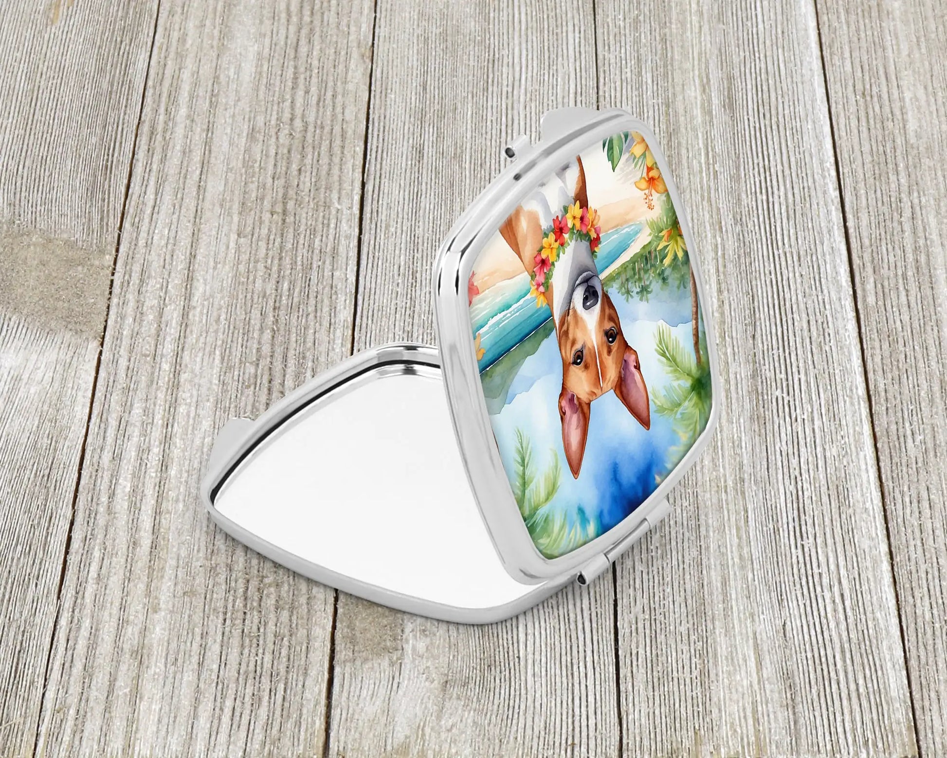 Compact Mirror featuring breed specific Basenji artwork. Introducing our Square Compact Mirror, a blend of elegance, functionality, and compactness, perfect for on-the-go touch-ups. This Silvertone metal mirror, with dimensions of 2.75 inches x 3 inches x .3 inches, fits effortlessly into your purse, handbag, or pocket, ensuring that you can check your appearance anytime, anywhere. Our compact mirror stands out with its eye-catching artwork on the front, adding a dash of style to this practical accessory. It is more than just a mirror; it's a statement piece that reflects your personality and aesthetic. When opened, this compact reveals two mirrors inside, doubling your perspective for precise touch-ups. The Silvertone metal construction ensures durability while maintaining a lightweight feel, making it an ideal everyday carry item. Whether you're rushing to a meeting, prepping for a dinner date, or just need a quick check on your look, our Square Compact Mirror is your reliable companion. Experience the perfect blend of style and practicality with this must-have accessory.