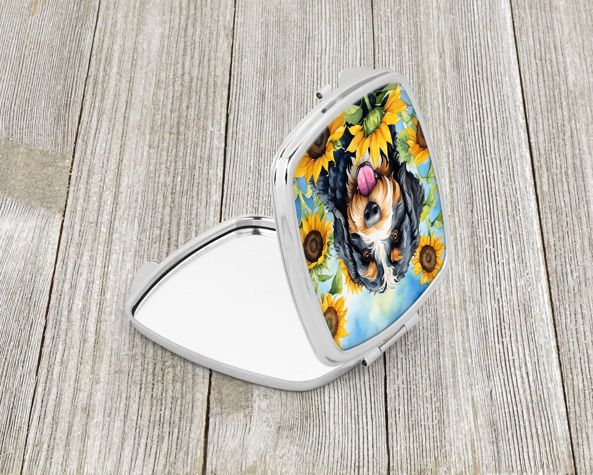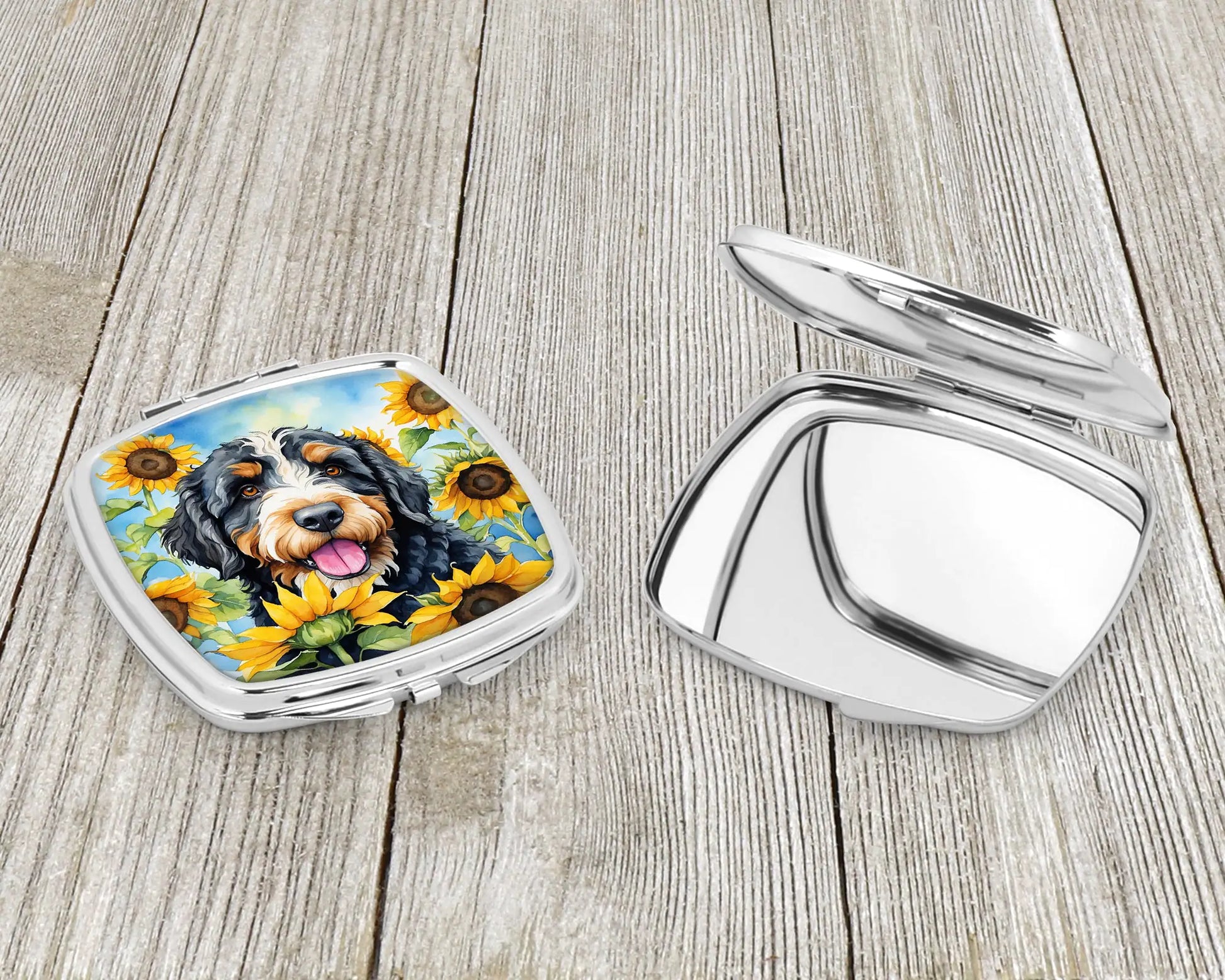 Compact Mirror featuring breed specific Bernedoodle artwork. Introducing our Square Compact Mirror, a blend of elegance, functionality, and compactness, perfect for on-the-go touch-ups. This Silvertone metal mirror, with dimensions of 2.75 inches x 3 inches x .3 inches, fits effortlessly into your purse, handbag, or pocket, ensuring that you can check your appearance anytime, anywhere. Our compact mirror stands out with its eye-catching artwork on the front, adding a dash of style to this practical accessory. It is more than just a mirror; it's a statement piece that reflects your personality and aesthetic. When opened, this compact reveals two mirrors inside, doubling your perspective for precise touch-ups. The Silvertone metal construction ensures durability while maintaining a lightweight feel, making it an ideal everyday carry item. Whether you're rushing to a meeting, prepping for a dinner date, or just need a quick check on your look, our Square Compact Mirror is your reliable companion. Experience the perfect blend of style and practicality with this must-have accessory.