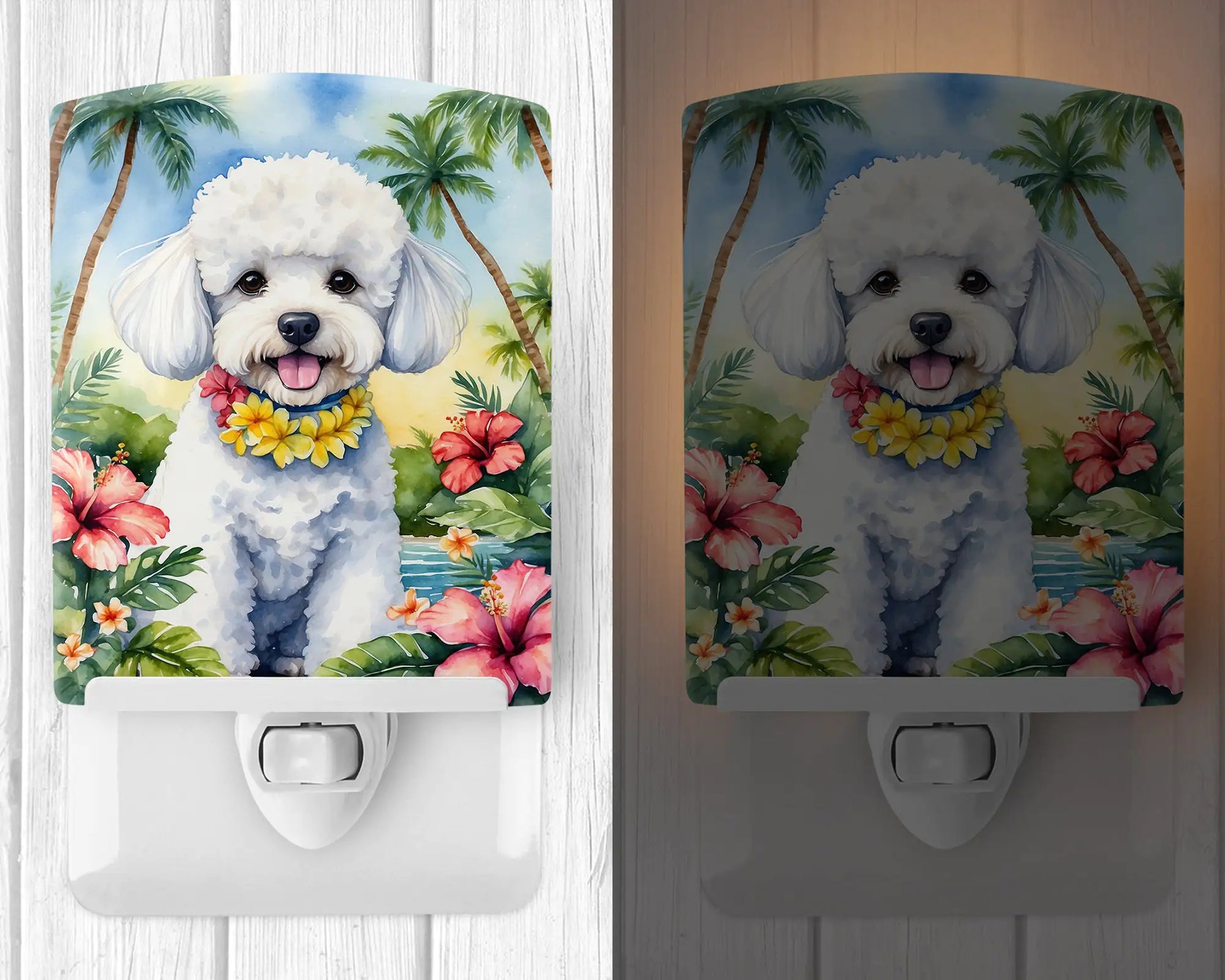 Ceramic Night Light featuring breed specific Bichon Frise artwork. Introduce a splash of artistic flair and subtle illumination to your space with the Decorative Ceramic Night Light from Caroline's Treasures. Perfect for any room, this night light seamlessly blends functionality with an aesthetic appeal, offering a stylish solution to brighten up dark corners of your home or office. Boasting a six-inch high by four-inch wide ceramic tile at the front, it showcases vivid, full-color artwork from distinguished artists, transforming a simple utility into a vibrant art piece. The artwork is securely encased in a robust metal holder, ensuring durability and longevity. Two screws are provided to firmly affix the tile into the holder. The holder extends three inches deep, housing an included bulb that emits a soft, welcoming glow. This product meets all safety standards, as evidenced by its UL approval. Proudly made in the United States from imported components, this Decorative Ceramic Night Light is not just a functional device; it's a statement piece that enhances the ambiance of your surroundings.