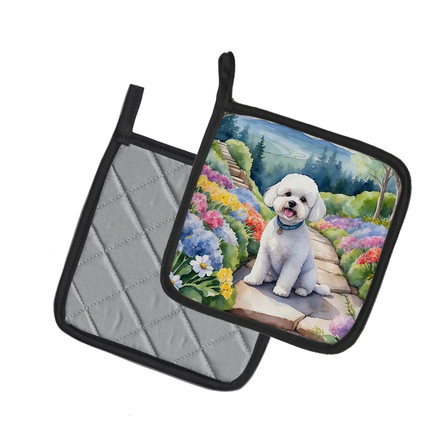 Pair of Pot Holders featuring breed specific Bichon Frise artwork. A Pair of Pot Holders to match your kitchen decor. Made in the USA these are thick and functional. Full color artwork decorates the front polyester fabric of the hot pad and accented by a black trim. Use these at as a trivet for your Thanksgiving or Christmas tablescape. Filled with insulated fabric and quilted for durability. These colorful pot holders will make a great gift for your favorite home cook or executive chef. Each pot holder measures approximately 7 1/2 inches by 7 1/2 inches. A hanging tab is included.