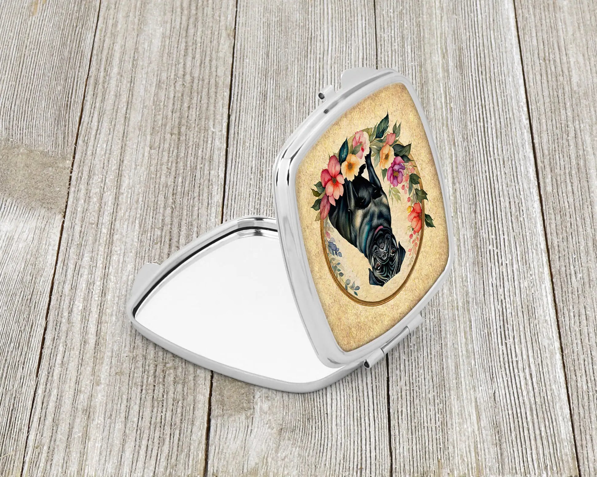 Compact Mirror featuring breed specific Pug artwork. Introducing our Square Compact Mirror, a blend of elegance, functionality, and compactness, perfect for on-the-go touch-ups. This Silvertone metal mirror, with dimensions of 2.75 inches x 3 inches x .3 inches, fits effortlessly into your purse, handbag, or pocket, ensuring that you can check your appearance anytime, anywhere. Our compact mirror stands out with its eye-catching artwork on the front, adding a dash of style to this practical accessory. It is more than just a mirror; it's a statement piece that reflects your personality and aesthetic. When opened, this compact reveals two mirrors inside, doubling your perspective for precise touch-ups. The Silvertone metal construction ensures durability while maintaining a lightweight feel, making it an ideal everyday carry item. Whether you're rushing to a meeting, prepping for a dinner date, or just need a quick check on your look, our Square Compact Mirror is your reliable companion. Experience the perfect blend of style and practicality with this must-have accessory.