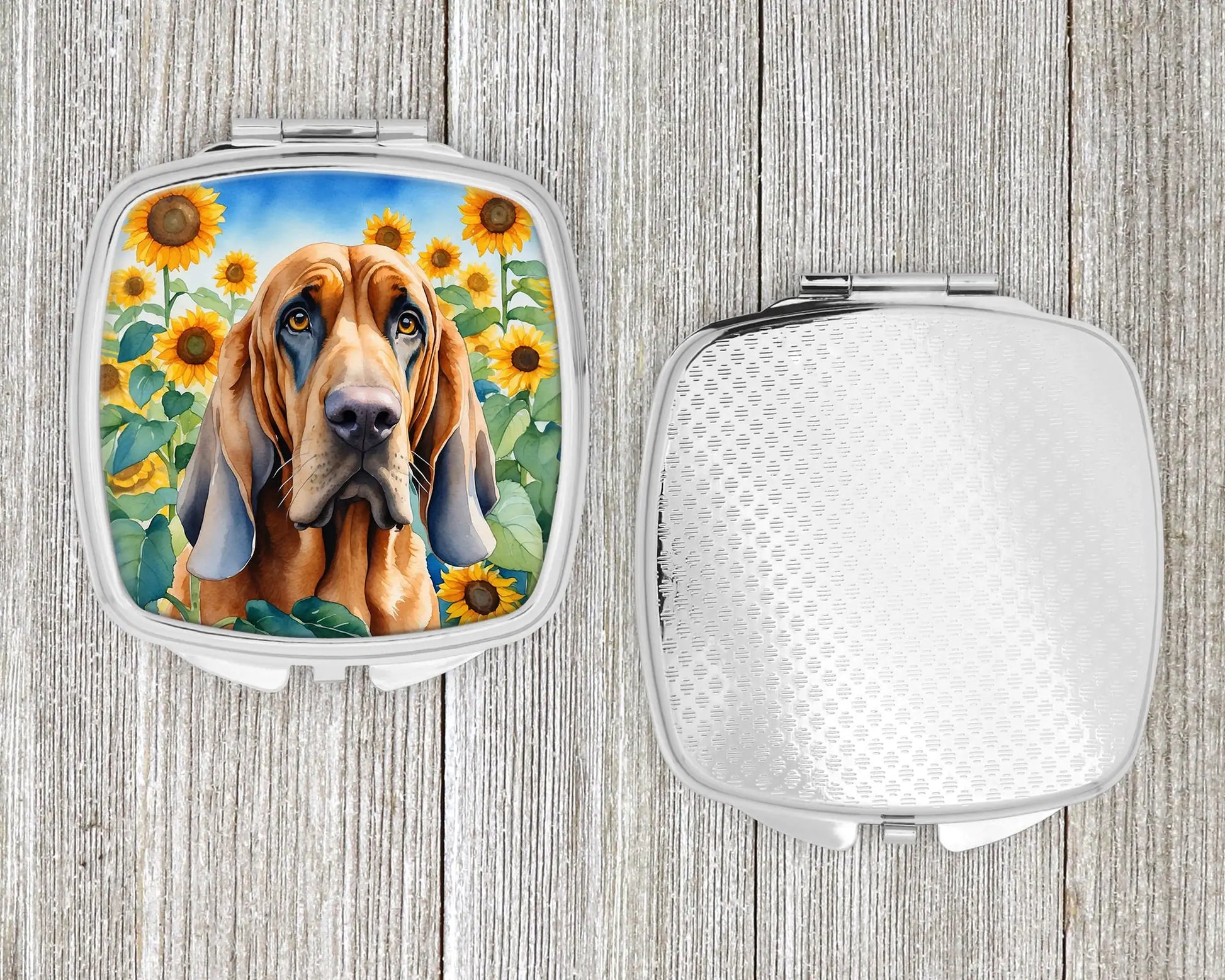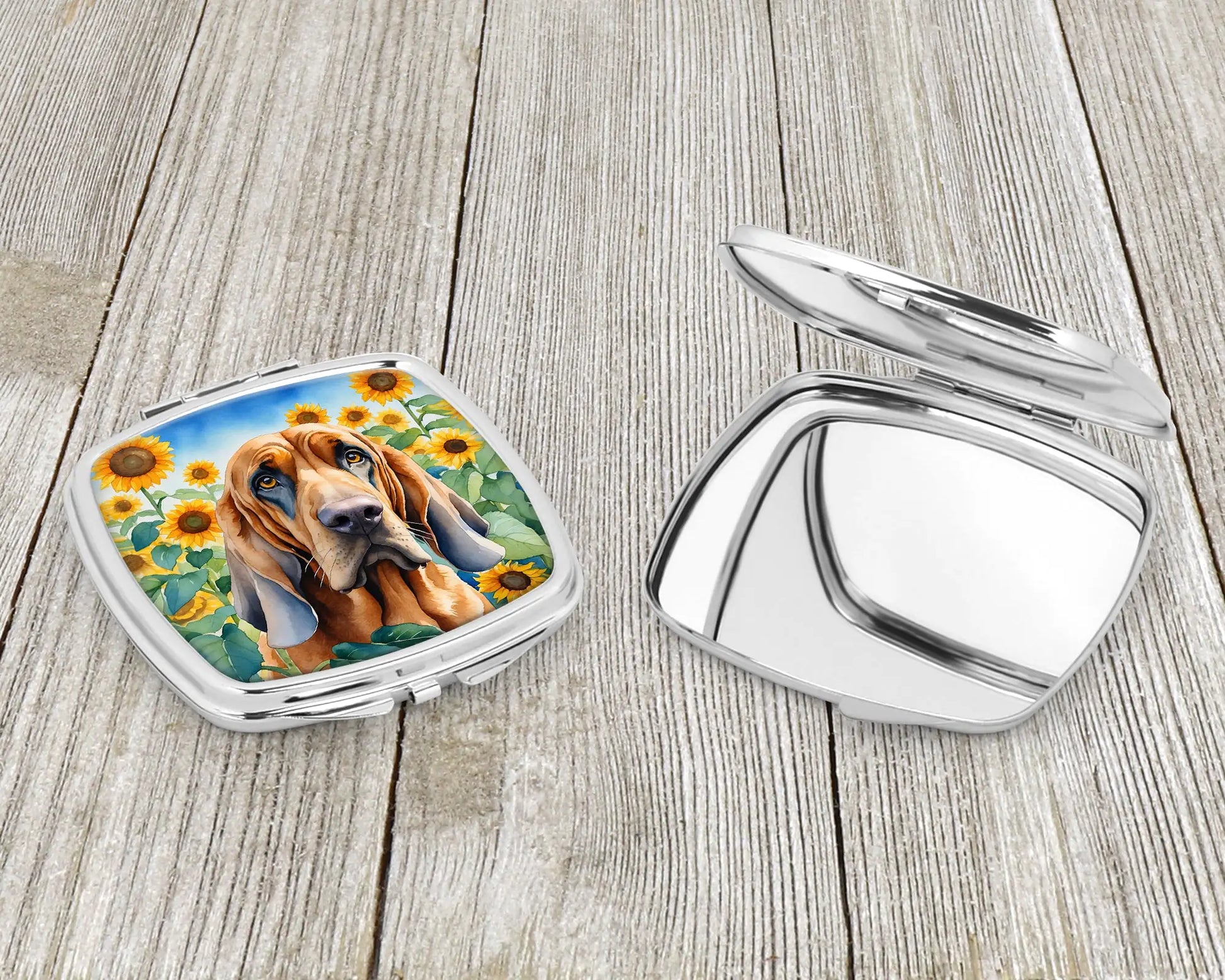Compact Mirror featuring breed specific Bloodhound artwork. Introducing our Square Compact Mirror, a blend of elegance, functionality, and compactness, perfect for on-the-go touch-ups. This Silvertone metal mirror, with dimensions of 2.75 inches x 3 inches x .3 inches, fits effortlessly into your purse, handbag, or pocket, ensuring that you can check your appearance anytime, anywhere. Our compact mirror stands out with its eye-catching artwork on the front, adding a dash of style to this practical accessory. It is more than just a mirror; it's a statement piece that reflects your personality and aesthetic. When opened, this compact reveals two mirrors inside, doubling your perspective for precise touch-ups. The Silvertone metal construction ensures durability while maintaining a lightweight feel, making it an ideal everyday carry item. Whether you're rushing to a meeting, prepping for a dinner date, or just need a quick check on your look, our Square Compact Mirror is your reliable companion. Experience the perfect blend of style and practicality with this must-have accessory.