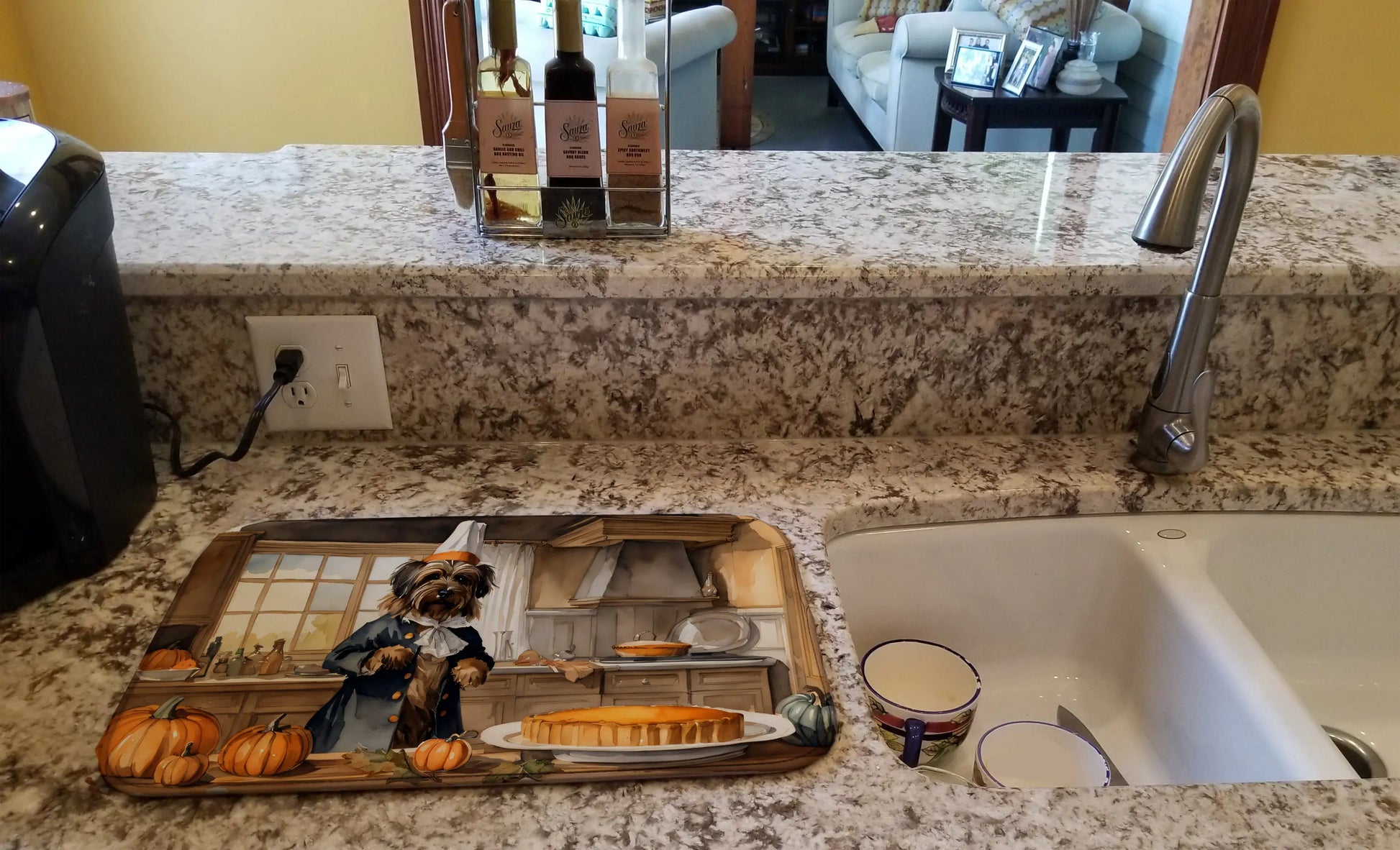 Dish Drying Mat featuring breed specific Briard artwork. Celebrate Halloween with this Halloween Dish Drying Mat. Say goodbye to messy countertops and soggy dish towels with our innovative dish drying mat. Our high-quality dish drying pad is designed to keep your countertops dry while offering a stylish and efficient solution. Whether you're air drying dishes, glasses, stemware, silverware, pots, pans, bottles, or even fruits and vegetables, our dish mat is the perfect choice. The 14 inches x 22 inches size fits most counters and dish drying racks, and the non-slip design ensures stability. Made with water-absorbent polyester and a polyurethane foam insert, our dish drying mat is not only functional but also durable. It's machine washable and printed in the USA for long-lasting use. The beautiful artwork adds flair to your kitchen decor, making it a perfect housewarming gift or present for any occasion. Upgrade your kitchen experience with our absorbent and versatile dish drying mat.