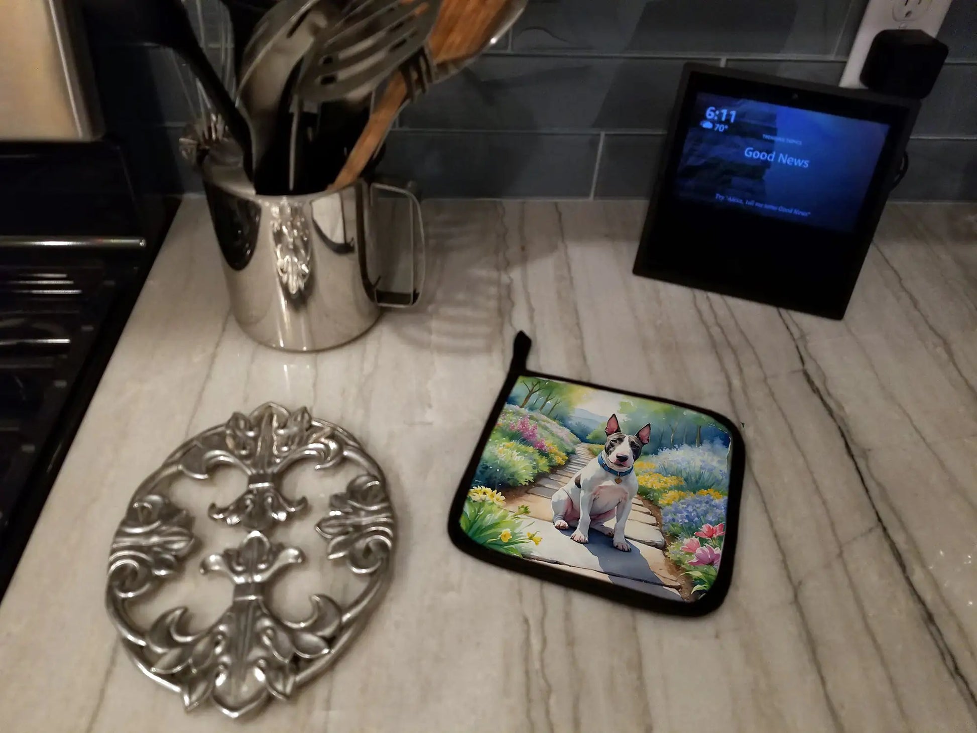 Pair of Pot Holders featuring breed specific Bull Terrier artwork. A Pair of Pot Holders to match your kitchen decor. Made in the USA these are thick and functional. Full color artwork decorates the front polyester fabric of the hot pad and accented by a black trim. Use these at as a trivet for your Thanksgiving or Christmas tablescape. Filled with insulated fabric and quilted for durability. These colorful pot holders will make a great gift for your favorite home cook or executive chef. Each pot holder measures approximately 7 1/2 inches by 7 1/2 inches. A hanging tab is included.