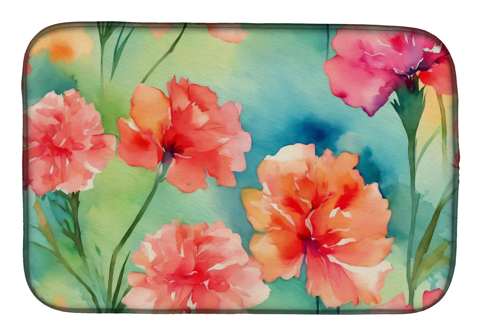 Dish Drying Mat featuring breed specific Carnations artwork. Say goodbye to messy countertops and soggy dish towels with our innovative dish drying mat. Our high-quality dish drying pad is designed to keep your countertops dry while offering a stylish and efficient solution. Whether you're air drying dishes, glasses, stemware, silverware, pots, pans, bottles, or even fruits and vegetables, our dish mat is the perfect choice. The 14 inches x 22 inches size fits most counters and dish drying racks, and the non-slip design ensures stability. Made with water-absorbent polyester and a polyurethane foam insert, our dish drying mat is not only functional but also durable. It's machine washable and printed in the USA for long-lasting use. The beautiful artwork adds flair to your kitchen decor, making it a perfect housewarming gift or present for any occasion. Upgrade your kitchen experience with our absorbent and versatile dish drying mat.