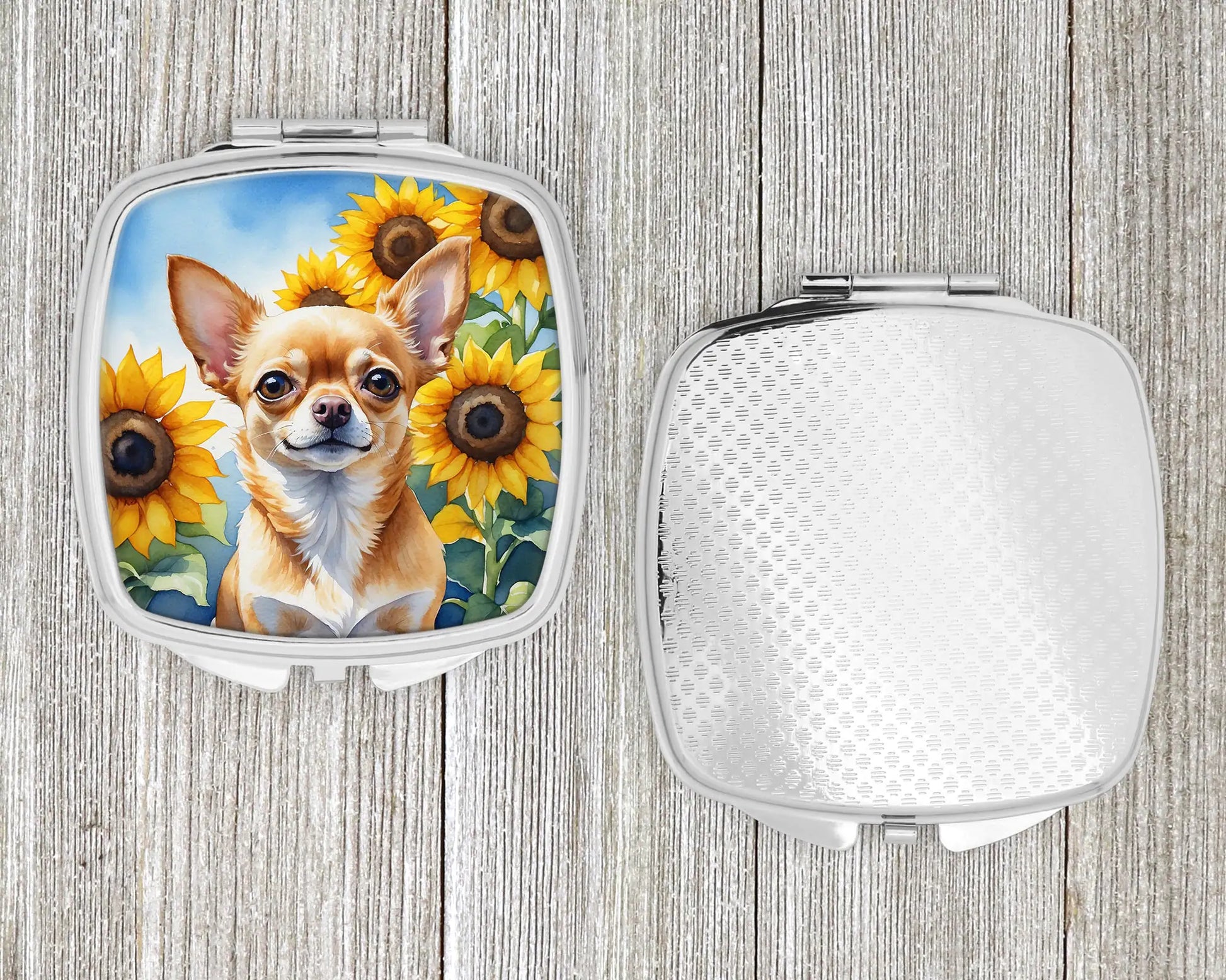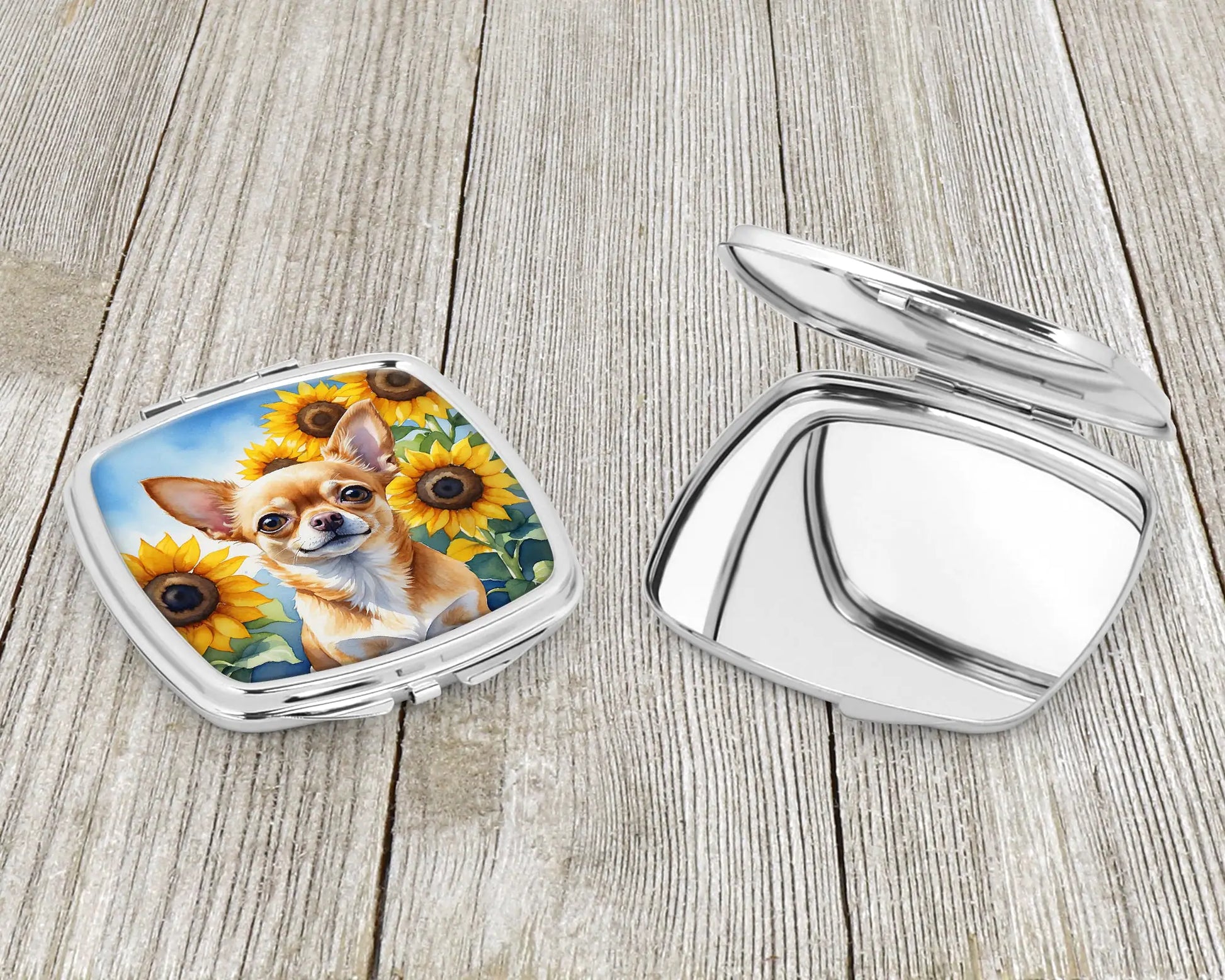 Compact Mirror featuring breed specific Chihuahua artwork. Introducing our Square Compact Mirror, a blend of elegance, functionality, and compactness, perfect for on-the-go touch-ups. This Silvertone metal mirror, with dimensions of 2.75 inches x 3 inches x .3 inches, fits effortlessly into your purse, handbag, or pocket, ensuring that you can check your appearance anytime, anywhere. Our compact mirror stands out with its eye-catching artwork on the front, adding a dash of style to this practical accessory. It is more than just a mirror; it's a statement piece that reflects your personality and aesthetic. When opened, this compact reveals two mirrors inside, doubling your perspective for precise touch-ups. The Silvertone metal construction ensures durability while maintaining a lightweight feel, making it an ideal everyday carry item. Whether you're rushing to a meeting, prepping for a dinner date, or just need a quick check on your look, our Square Compact Mirror is your reliable companion. Experience the perfect blend of style and practicality with this must-have accessory.