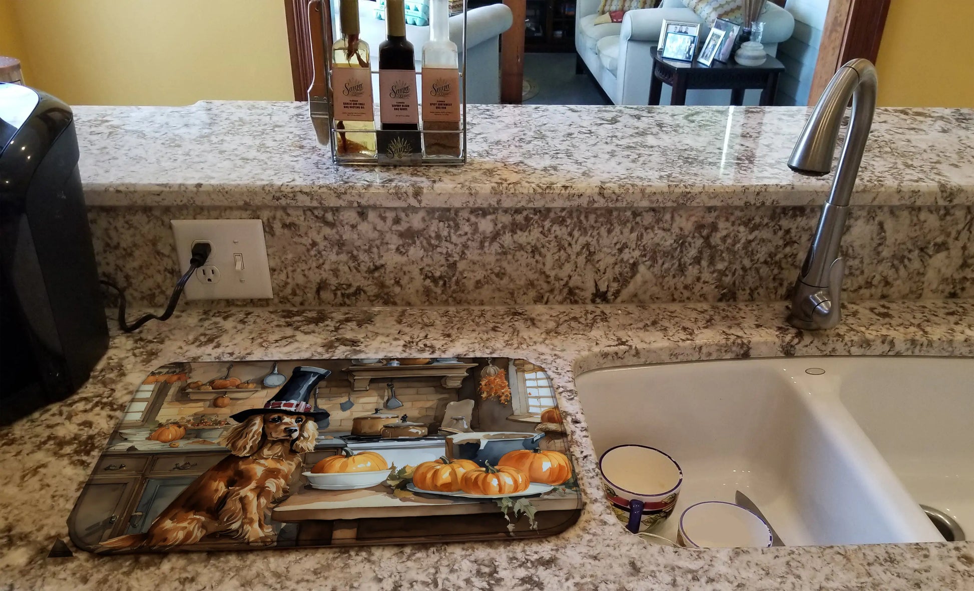 Dish Drying Mat featuring breed specific Cocker Spaniel artwork. Celebrate Halloween with this Halloween Dish Drying Mat. Say goodbye to messy countertops and soggy dish towels with our innovative dish drying mat. Our high-quality dish drying pad is designed to keep your countertops dry while offering a stylish and efficient solution. Whether you're air drying dishes, glasses, stemware, silverware, pots, pans, bottles, or even fruits and vegetables, our dish mat is the perfect choice. The 14 inches x 22 inches size fits most counters and dish drying racks, and the non-slip design ensures stability. Made with water-absorbent polyester and a polyurethane foam insert, our dish drying mat is not only functional but also durable. It's machine washable and printed in the USA for long-lasting use. The beautiful artwork adds flair to your kitchen decor, making it a perfect housewarming gift or present for any occasion. Upgrade your kitchen experience with our absorbent and versatile dish drying mat.