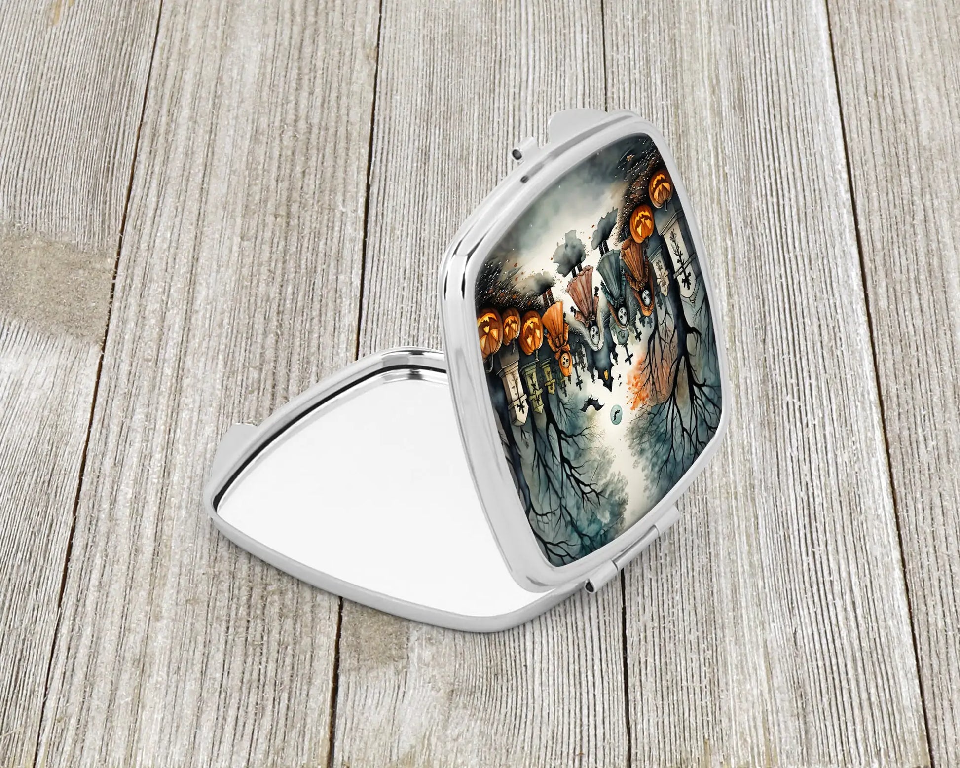 Celebrate Halloween with this Halloween Compact Mirror. Introducing our Square Compact Mirror, a blend of elegance, functionality, and compactness, perfect for on-the-go touch-ups. This Silvertone metal mirror, with dimensions of 2.75 inches x 3 inches x .3 inches, fits effortlessly into your purse, handbag, or pocket, ensuring that you can check your appearance anytime, anywhere. Our compact mirror stands out with its eye-catching artwork on the front, adding a dash of style to this practical accessory. It is more than just a mirror; it's a statement piece that reflects your personality and aesthetic. When opened, this compact reveals two mirrors inside, doubling your perspective for precise touch-ups. The Silvertone metal construction ensures durability while maintaining a lightweight feel, making it an ideal everyday carry item. Whether you're rushing to a meeting, prepping for a dinner date, or just need a quick check on your look, our Square Compact Mirror is your reliable companion. Experience the perfect blend of style and practicality with this must-have accessory.