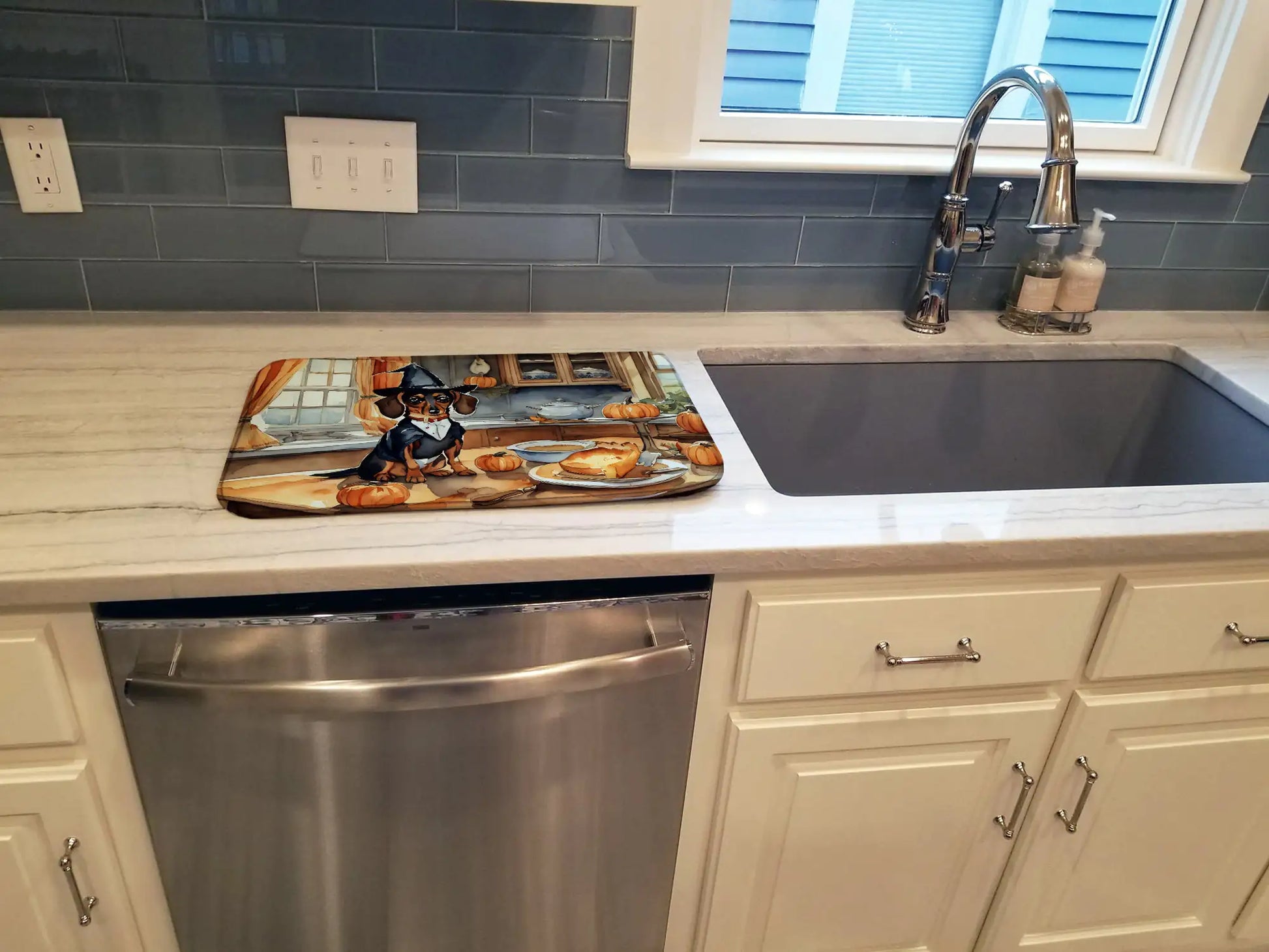 Dish Drying Mat featuring breed specific Dachshund artwork. Celebrate Halloween with this Halloween Dish Drying Mat. Say goodbye to messy countertops and soggy dish towels with our innovative dish drying mat. Our high-quality dish drying pad is designed to keep your countertops dry while offering a stylish and efficient solution. Whether you're air drying dishes, glasses, stemware, silverware, pots, pans, bottles, or even fruits and vegetables, our dish mat is the perfect choice. The 14 inches x 22 inches size fits most counters and dish drying racks, and the non-slip design ensures stability. Made with water-absorbent polyester and a polyurethane foam insert, our dish drying mat is not only functional but also durable. It's machine washable and printed in the USA for long-lasting use. The beautiful artwork adds flair to your kitchen decor, making it a perfect housewarming gift or present for any occasion. Upgrade your kitchen experience with our absorbent and versatile dish drying mat.