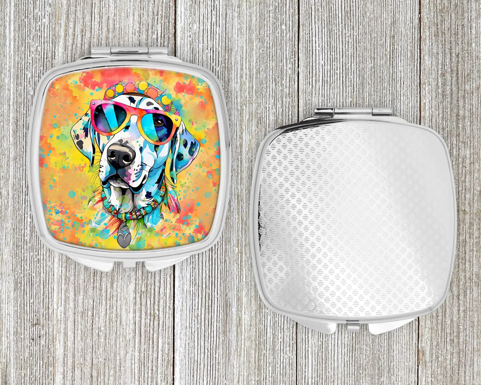 Compact Mirror featuring breed specific Dalmatian artwork. Introducing our Square Compact Mirror, a blend of elegance, functionality, and compactness, perfect for on-the-go touch-ups. This Silvertone metal mirror, with dimensions of 2.75 inches x 3 inches x .3 inches, fits effortlessly into your purse, handbag, or pocket, ensuring that you can check your appearance anytime, anywhere. Our compact mirror stands out with its eye-catching artwork on the front, adding a dash of style to this practical accessory. It is more than just a mirror; it's a statement piece that reflects your personality and aesthetic. When opened, this compact reveals two mirrors inside, doubling your perspective for precise touch-ups. The Silvertone metal construction ensures durability while maintaining a lightweight feel, making it an ideal everyday carry item. Whether you're rushing to a meeting, prepping for a dinner date, or just need a quick check on your look, our Square Compact Mirror is your reliable companion. Experience the perfect blend of style and practicality with this must-have accessory.
