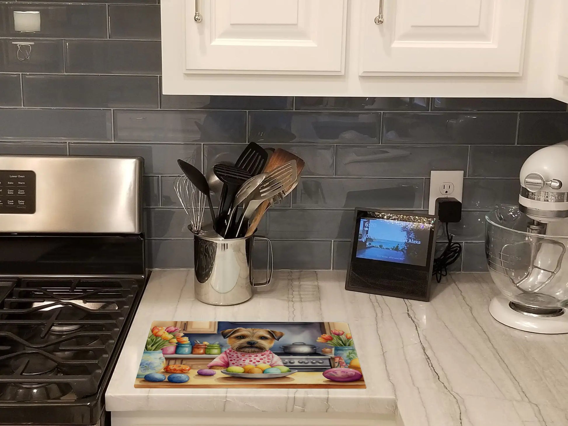 Glass Cutting Board featuring breed specific Border Terrier artwork. Celebrate Easter with this Easter Cutting Board. Introduce your kitchen to the vibrant, large Decorative Glass Cutting Board from Caroline's Treasures. Crafted from resilient tempered glass, this board is not only a utilitarian necessity but also a colorful art piece. With its generous dimensions of 15 inches in height and 12 inches in length, it offers ample space for all your cutting needs. Every piece showcases captivating artwork from distinguished artists, bringing an aesthetic edge to your kitchen. Beyond its attractive design, this cutting board ensures your countertop stays pristine and unscathed, owing to its heat-resistant properties. Engineered with user convenience in mind, it features non-skid feet for stability, and rounded corners for additional safety. Its robust construction renders it virtually unbreakable, guaranteeing longevity. The board comes with protective feet bumpers, maintaining its position during use. This product is recommended to be hand washed only. Proudly printed and assembled in the United States, this cutting board exemplifies superior craftsmanship. With Caroline's Treasures' Decorative Glass Cutting Board, you're investing in a blend of functionality and artistic flair.