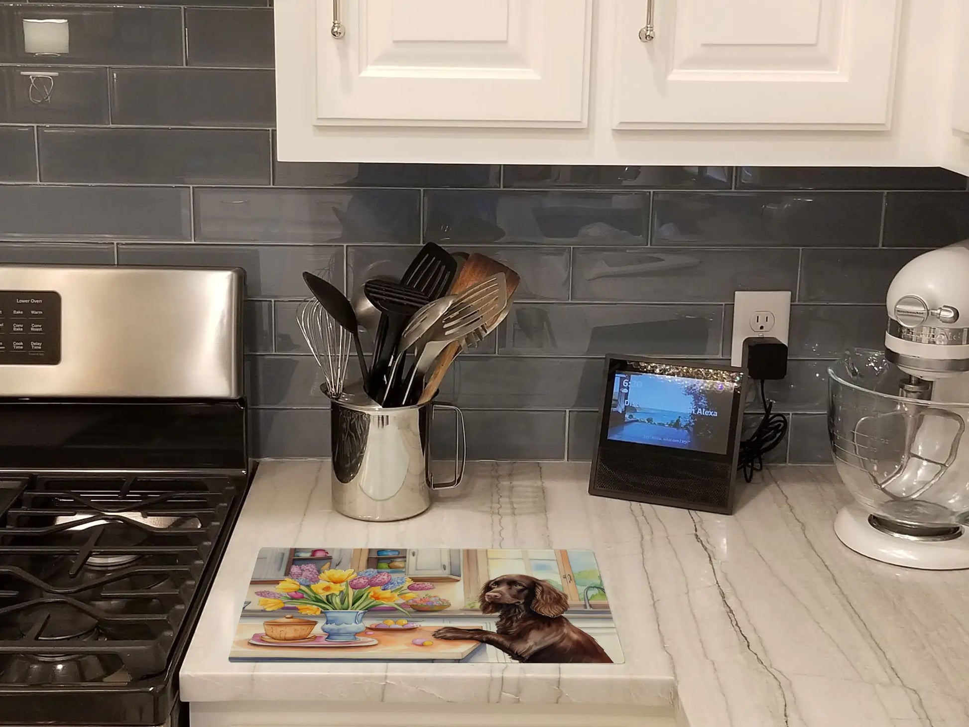 Glass Cutting Board featuring breed specific Boykin Spaniel artwork. Celebrate Easter with this Easter Cutting Board. Introduce your kitchen to the vibrant, large Decorative Glass Cutting Board from Caroline's Treasures. Crafted from resilient tempered glass, this board is not only a utilitarian necessity but also a colorful art piece. With its generous dimensions of 15 inches in height and 12 inches in length, it offers ample space for all your cutting needs. Every piece showcases captivating artwork from distinguished artists, bringing an aesthetic edge to your kitchen. Beyond its attractive design, this cutting board ensures your countertop stays pristine and unscathed, owing to its heat-resistant properties. Engineered with user convenience in mind, it features non-skid feet for stability, and rounded corners for additional safety. Its robust construction renders it virtually unbreakable, guaranteeing longevity. The board comes with protective feet bumpers, maintaining its position during use. This product is recommended to be hand washed only. Proudly printed and assembled in the United States, this cutting board exemplifies superior craftsmanship. With Caroline's Treasures' Decorative Glass Cutting Board, you're investing in a blend of functionality and artistic flair.