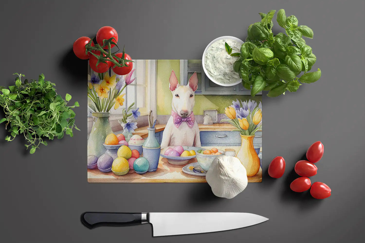 Decorating Easter Bull Terrier Glass Cutting Board