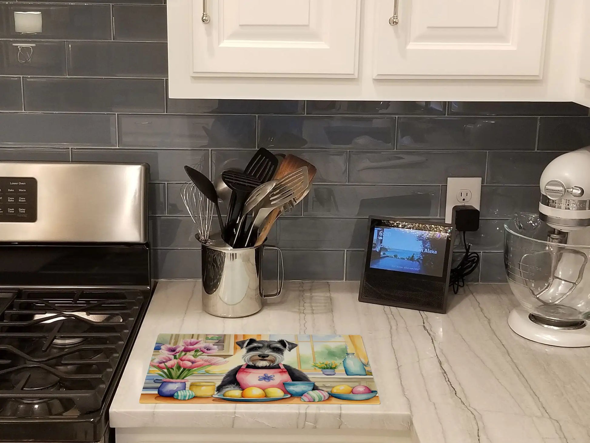 Glass Cutting Board featuring breed specific Schnauzer artwork. Celebrate Easter with this Easter Cutting Board. Introduce your kitchen to the vibrant, large Decorative Glass Cutting Board from Caroline's Treasures. Crafted from resilient tempered glass, this board is not only a utilitarian necessity but also a colorful art piece. With its generous dimensions of 15 inches in height and 12 inches in length, it offers ample space for all your cutting needs. Every piece showcases captivating artwork from distinguished artists, bringing an aesthetic edge to your kitchen. Beyond its attractive design, this cutting board ensures your countertop stays pristine and unscathed, owing to its heat-resistant properties. Engineered with user convenience in mind, it features non-skid feet for stability, and rounded corners for additional safety. Its robust construction renders it virtually unbreakable, guaranteeing longevity. The board comes with protective feet bumpers, maintaining its position during use. This product is recommended to be hand washed only. Proudly printed and assembled in the United States, this cutting board exemplifies superior craftsmanship. With Caroline's Treasures' Decorative Glass Cutting Board, you're investing in a blend of functionality and artistic flair.