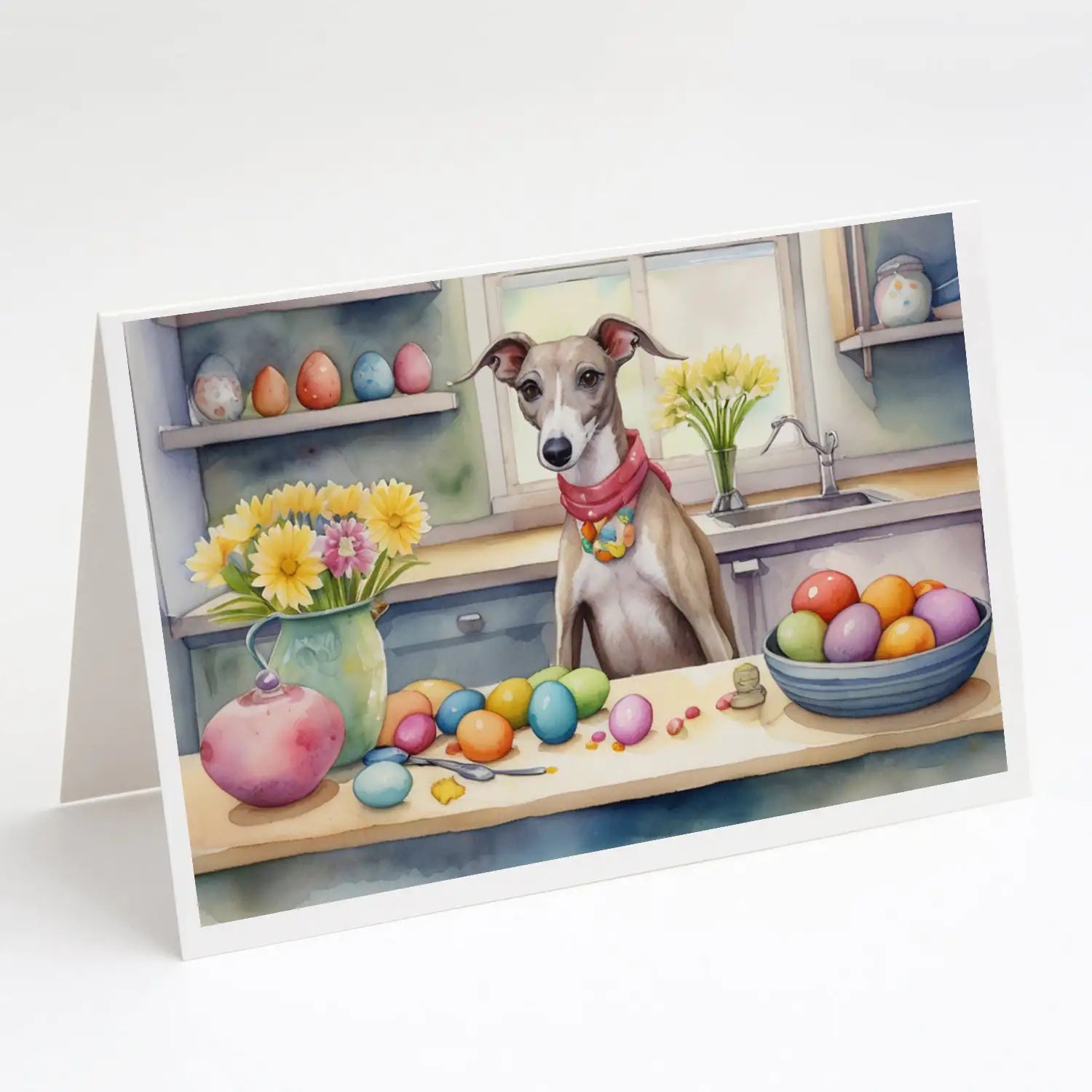 Greeting Cards Pack of 8 featuring breed specific Whippet artwork. Celebrate Easter with this Easter . Celebrate special moments with Caroline's Treasures Printed Greeting Card Pack. This pack includes eight beautifully folded 5x7 cards, accompanied by eight matching white envelopes. With blank interiors, these cards provide ample space for your personalized messages and heartfelt holiday greetings. Each card features captivating full-color artwork, meticulously printed in our facility on high-quality 80 lb cover stock or 216 GSM. The super smooth finish of the white cards enhances the visual impact of the artwork, creating a truly stunning presentation. Designed by our talented in-house artists or licensed artists, the artwork on these cards showcases their creativity and attention to detail. From vibrant illustrations to captivating designs, each card tells its own unique story. Whether it's for birthdays, anniversaries, holidays, or any special occasion, Caroline's Treasures Greeting Card Pack is the perfect way to convey your heartfelt sentiments. Share joy, love, and warm wishes with these exquisite cards and make every moment unforgettable.