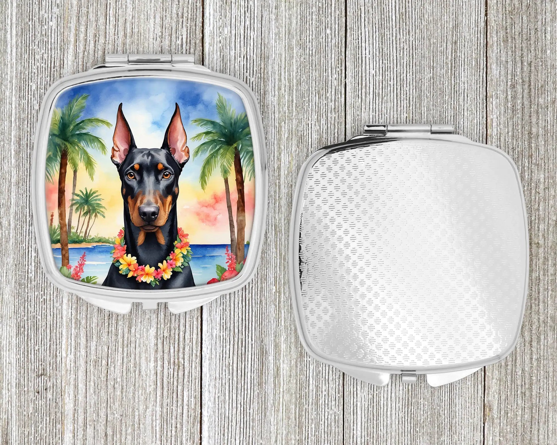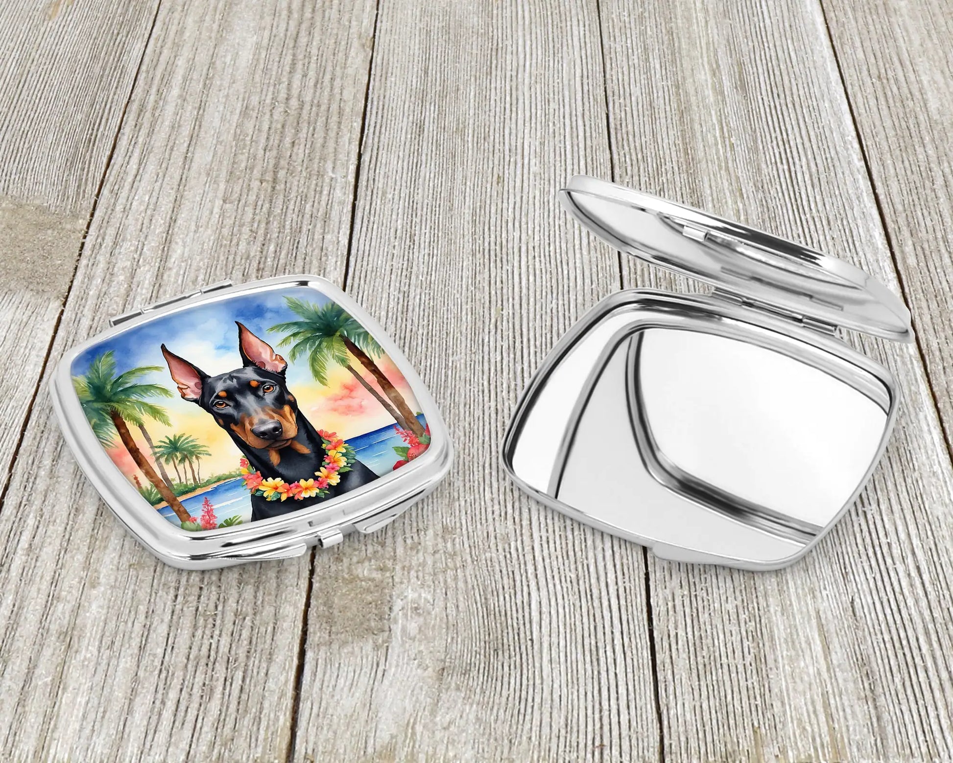 Compact Mirror featuring breed specific Doberman Pinscher artwork. Introducing our Square Compact Mirror, a blend of elegance, functionality, and compactness, perfect for on-the-go touch-ups. This Silvertone metal mirror, with dimensions of 2.75 inches x 3 inches x .3 inches, fits effortlessly into your purse, handbag, or pocket, ensuring that you can check your appearance anytime, anywhere. Our compact mirror stands out with its eye-catching artwork on the front, adding a dash of style to this practical accessory. It is more than just a mirror; it's a statement piece that reflects your personality and aesthetic. When opened, this compact reveals two mirrors inside, doubling your perspective for precise touch-ups. The Silvertone metal construction ensures durability while maintaining a lightweight feel, making it an ideal everyday carry item. Whether you're rushing to a meeting, prepping for a dinner date, or just need a quick check on your look, our Square Compact Mirror is your reliable companion. Experience the perfect blend of style and practicality with this must-have accessory.