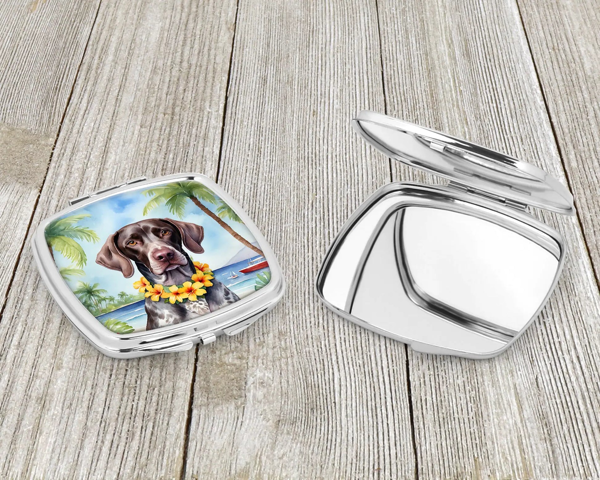 Compact Mirror featuring breed specific German Shorthaired Pointer artwork. Introducing our Square Compact Mirror, a blend of elegance, functionality, and compactness, perfect for on-the-go touch-ups. This Silvertone metal mirror, with dimensions of 2.75 inches x 3 inches x .3 inches, fits effortlessly into your purse, handbag, or pocket, ensuring that you can check your appearance anytime, anywhere. Our compact mirror stands out with its eye-catching artwork on the front, adding a dash of style to this practical accessory. It is more than just a mirror; it's a statement piece that reflects your personality and aesthetic. When opened, this compact reveals two mirrors inside, doubling your perspective for precise touch-ups. The Silvertone metal construction ensures durability while maintaining a lightweight feel, making it an ideal everyday carry item. Whether you're rushing to a meeting, prepping for a dinner date, or just need a quick check on your look, our Square Compact Mirror is your reliable companion. Experience the perfect blend of style and practicality with this must-have accessory.
