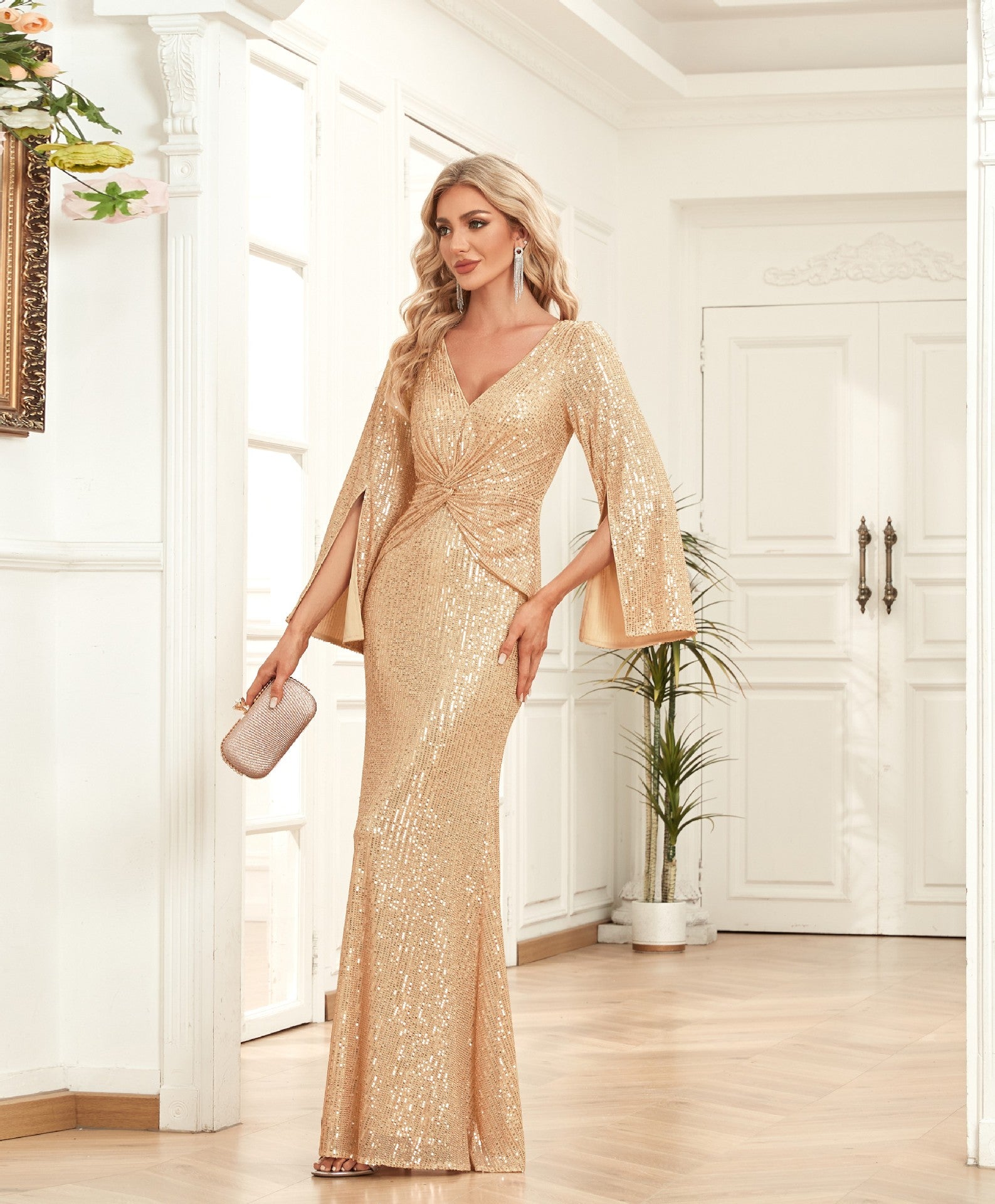 Gold Sequin Slim Fishtail Bridesmaid Banquet Evening Dress