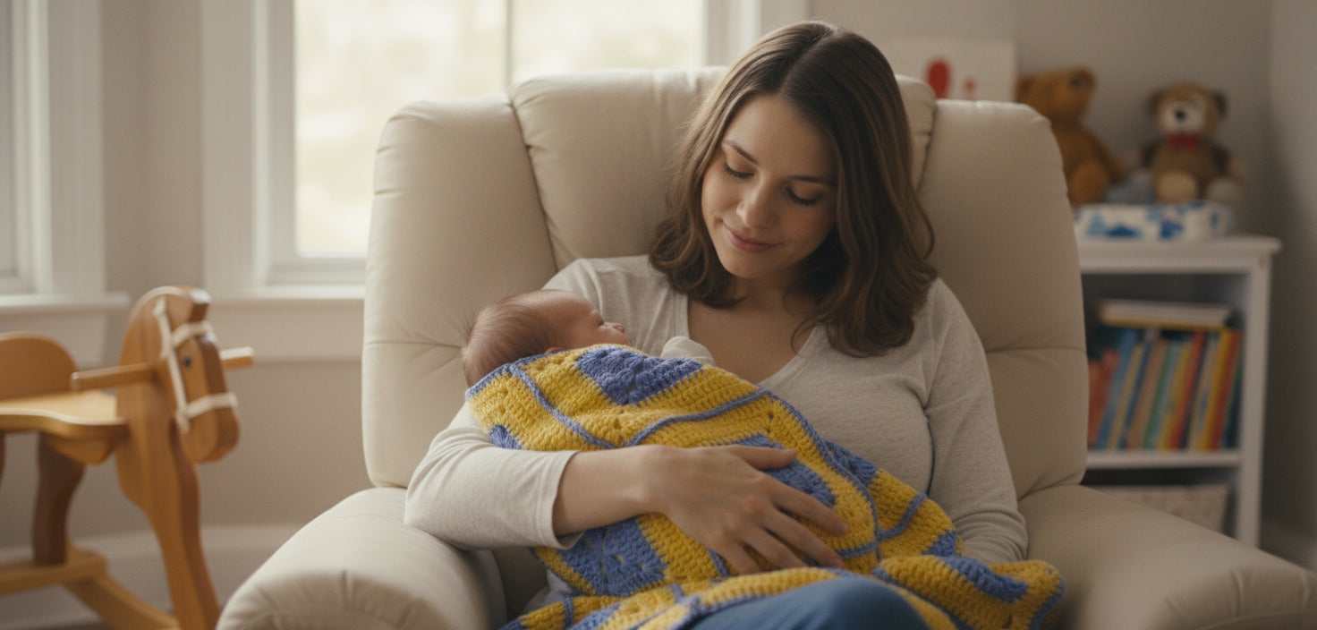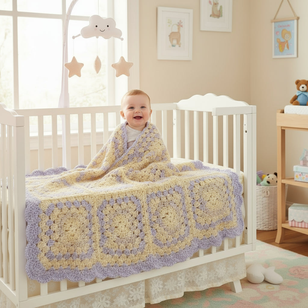Introducing this beautiful handmade multi-purpose blanket in shades of yellow and light purple, with a lovely crochet design. Perfect for a baby's nursery or as a cozy throw for any room in the house.