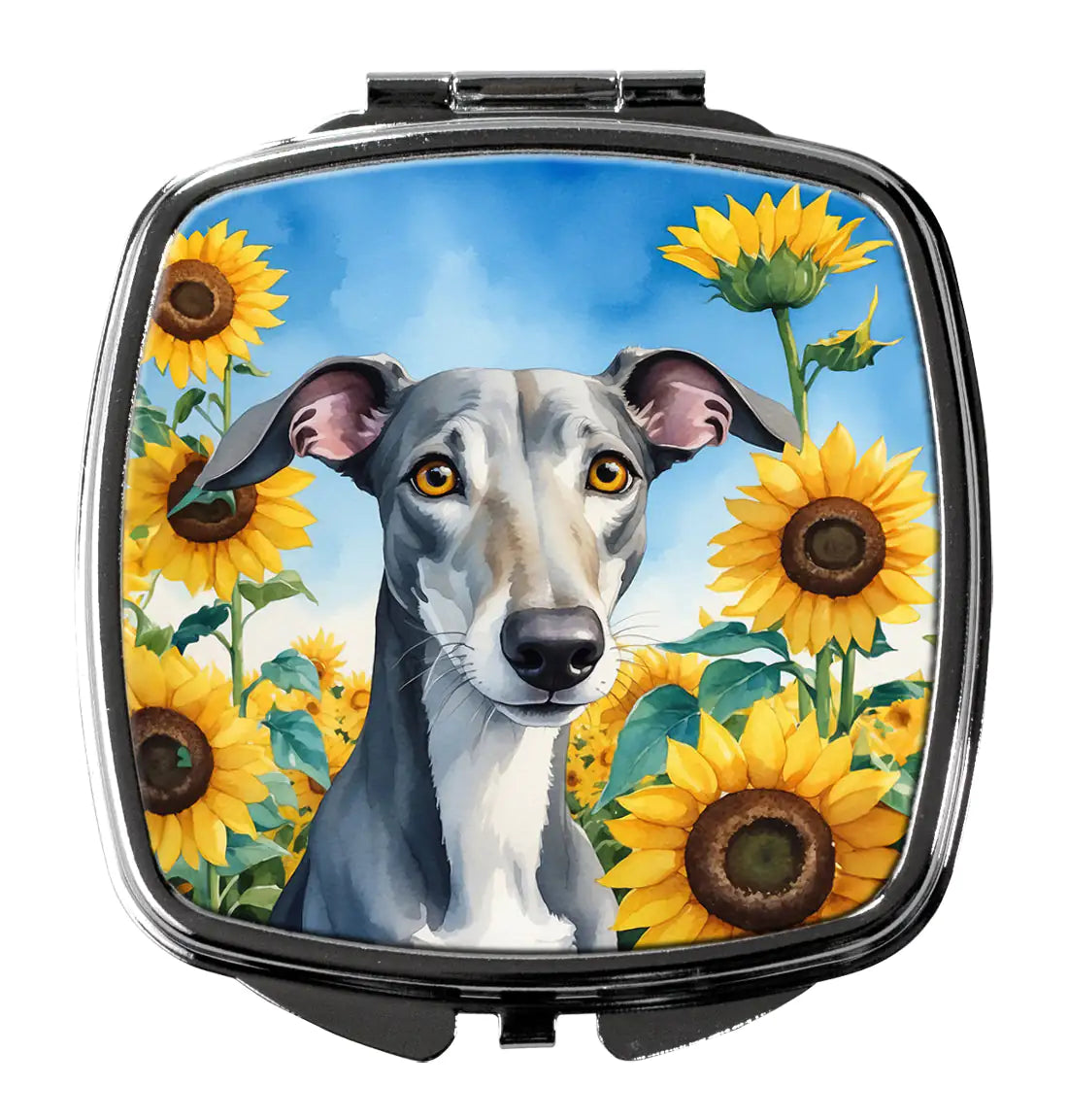 Compact Mirror featuring breed specific Greyhound artwork. Introducing our Square Compact Mirror, a blend of elegance, functionality, and compactness, perfect for on-the-go touch-ups. This Silvertone metal mirror, with dimensions of 2.75 inches x 3 inches x .3 inches, fits effortlessly into your purse, handbag, or pocket, ensuring that you can check your appearance anytime, anywhere. Our compact mirror stands out with its eye-catching artwork on the front, adding a dash of style to this practical accessory. It is more than just a mirror; it's a statement piece that reflects your personality and aesthetic. When opened, this compact reveals two mirrors inside, doubling your perspective for precise touch-ups. The Silvertone metal construction ensures durability while maintaining a lightweight feel, making it an ideal everyday carry item. Whether you're rushing to a meeting, prepping for a dinner date, or just need a quick check on your look, our Square Compact Mirror is your reliable companion. Experience the perfect blend of style and practicality with this must-have accessory.