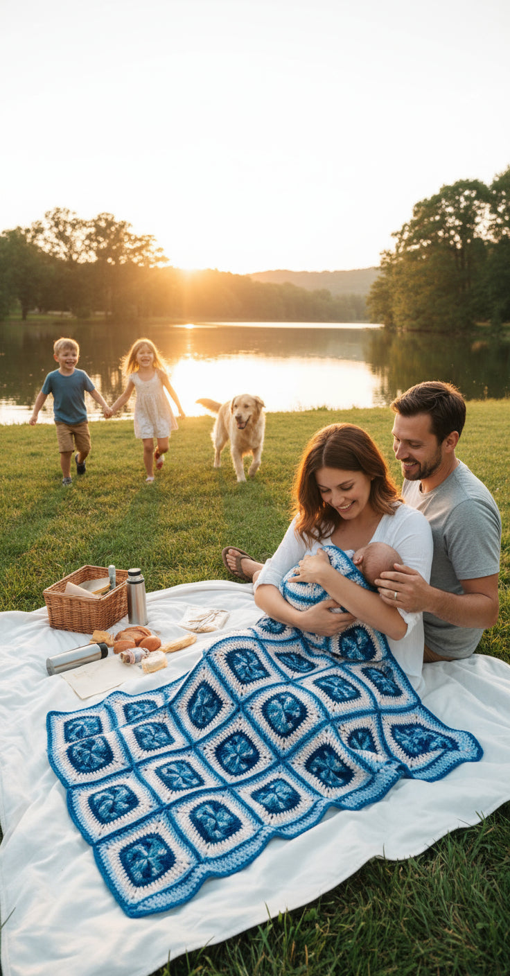 Indulge in the warmth and comfort of this handmade multi-purpose blanket. The intricate granny square design features a stunning blend of blue, white, and light blue colors, finished with a delicate blue border. Each stitch is carefully hand-crocheted, making this blanket a truly unique piece.
