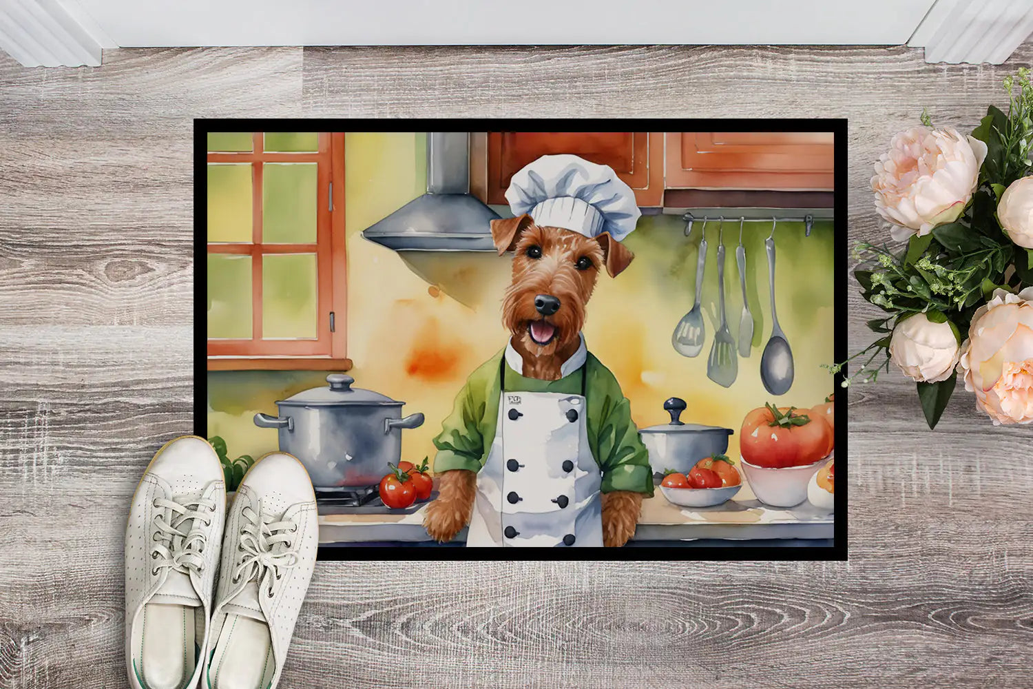 Doormat featuring breed specific Irish Terrier artwork. Welcome your guests in style with our Artwork Door Mat, designed to withstand almost any weather condition. This mat, measuring approximately 18 by 27 inches, is held together by durable black binding tape. Its top layer, composed of polyester felt, is dyed with the eye-catching image you see on the mat. A few layers below provide the mat with stability, while its rubber bottom is stamped to help prevent slipping and ensures safety. Our mat works wonderfully as both an indoor or outdoor door mat. For cleaning, simply hose it off with water or use a power washer - no need for any cleaner that produces suds. Avoid scrubbing with a brush, instead, opt for the vacuum on floor setting. Designed manufactured and printed in the USA, this mat is a perfect addition to your porch, outdoor kitchen, entryway, or any indoor space. Its unique design makes it a charming decorative rug that greets your guests and adds a stylish touch to your home decor.