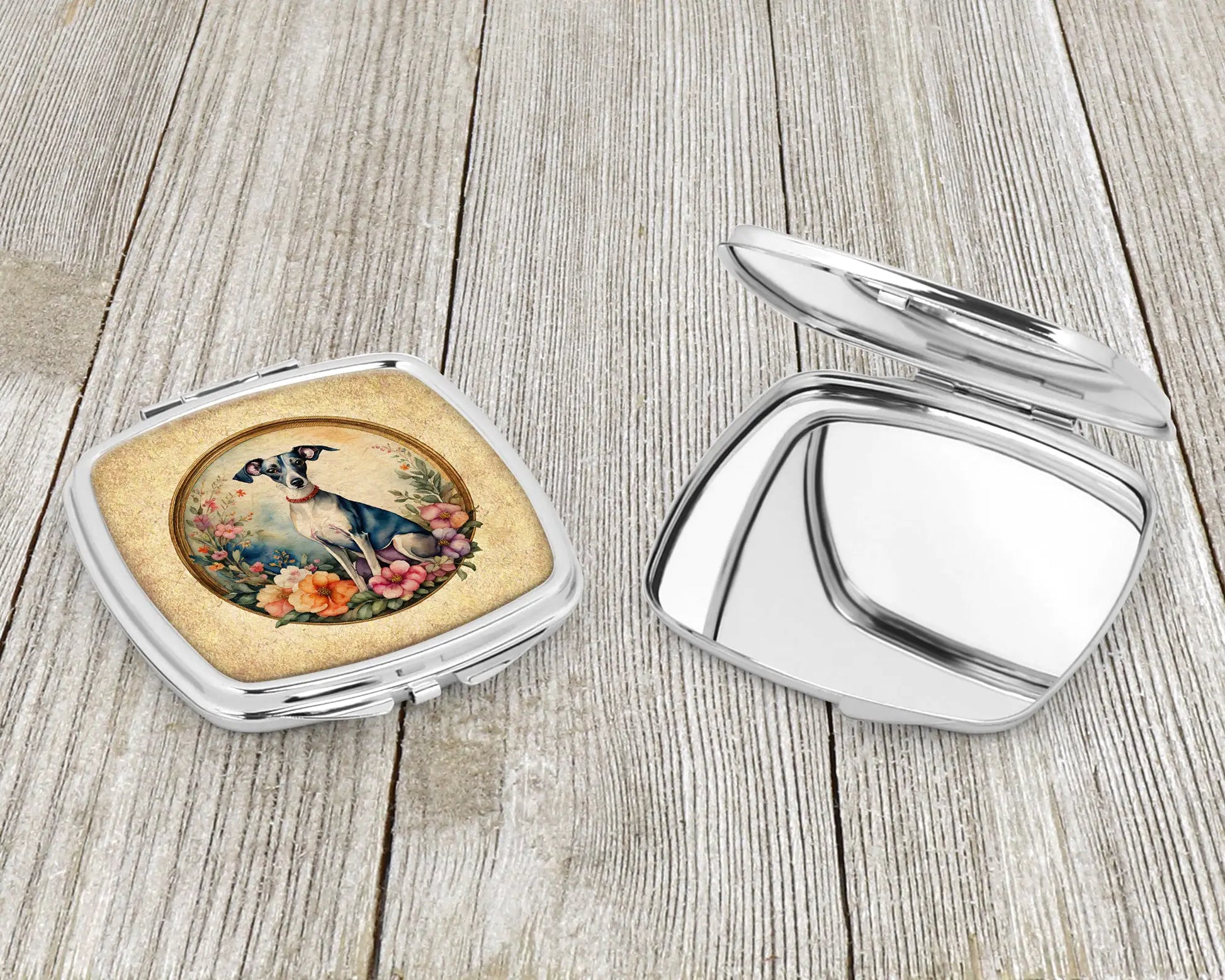 Compact Mirror featuring breed specific Italian Greyhound artwork. Introducing our Square Compact Mirror, a blend of elegance, functionality, and compactness, perfect for on-the-go touch-ups. This Silvertone metal mirror, with dimensions of 2.75 inches x 3 inches x .3 inches, fits effortlessly into your purse, handbag, or pocket, ensuring that you can check your appearance anytime, anywhere. Our compact mirror stands out with its eye-catching artwork on the front, adding a dash of style to this practical accessory. It is more than just a mirror; it's a statement piece that reflects your personality and aesthetic. When opened, this compact reveals two mirrors inside, doubling your perspective for precise touch-ups. The Silvertone metal construction ensures durability while maintaining a lightweight feel, making it an ideal everyday carry item. Whether you're rushing to a meeting, prepping for a dinner date, or just need a quick check on your look, our Square Compact Mirror is your reliable companion. Experience the perfect blend of style and practicality with this must-have accessory.