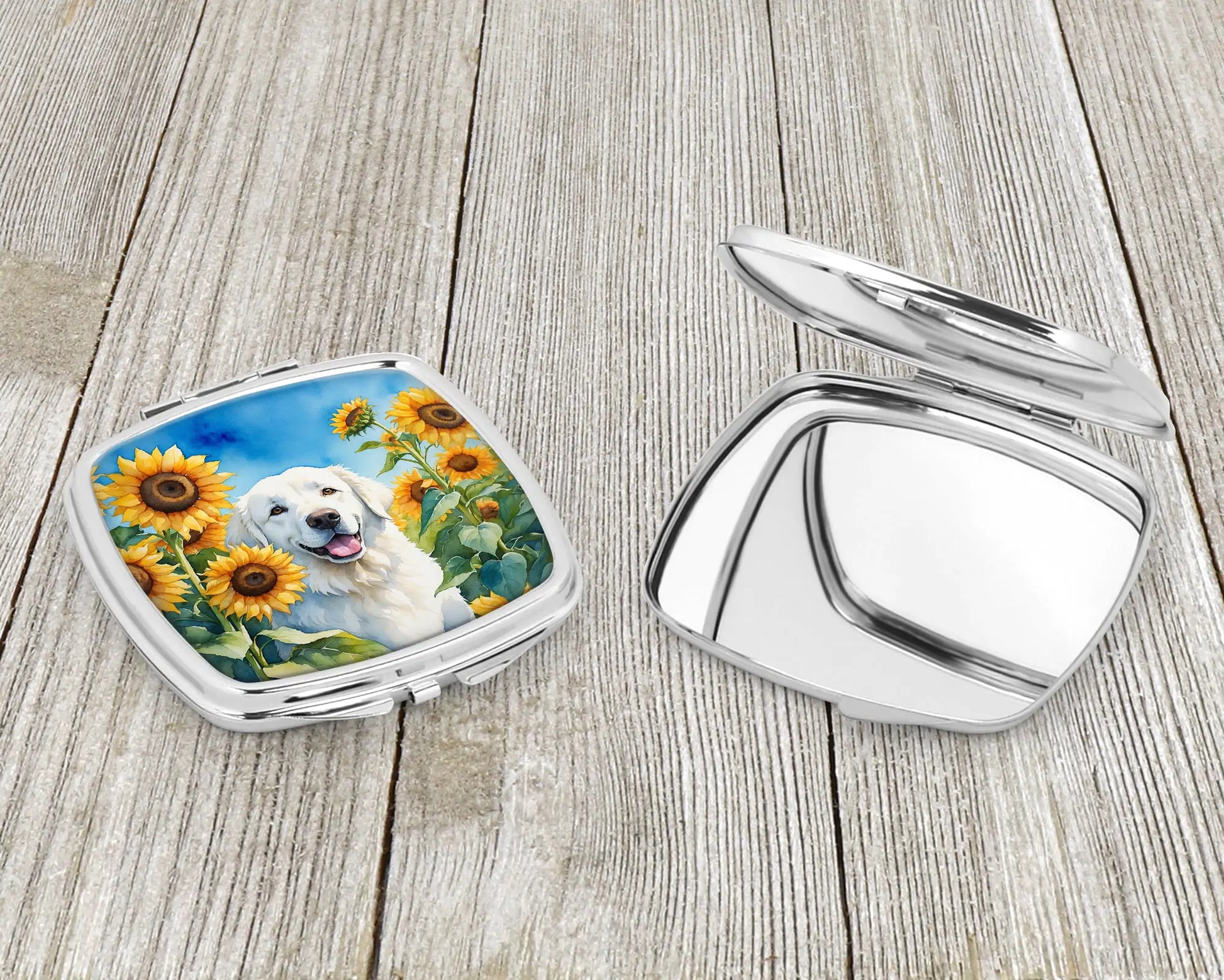 Compact Mirror featuring breed specific Kuvasz artwork. Introducing our Square Compact Mirror, a blend of elegance, functionality, and compactness, perfect for on-the-go touch-ups. This Silvertone metal mirror, with dimensions of 2.75 inches x 3 inches x .3 inches, fits effortlessly into your purse, handbag, or pocket, ensuring that you can check your appearance anytime, anywhere. Our compact mirror stands out with its eye-catching artwork on the front, adding a dash of style to this practical accessory. It is more than just a mirror; it's a statement piece that reflects your personality and aesthetic. When opened, this compact reveals two mirrors inside, doubling your perspective for precise touch-ups. The Silvertone metal construction ensures durability while maintaining a lightweight feel, making it an ideal everyday carry item. Whether you're rushing to a meeting, prepping for a dinner date, or just need a quick check on your look, our Square Compact Mirror is your reliable companion. Experience the perfect blend of style and practicality with this must-have accessory.