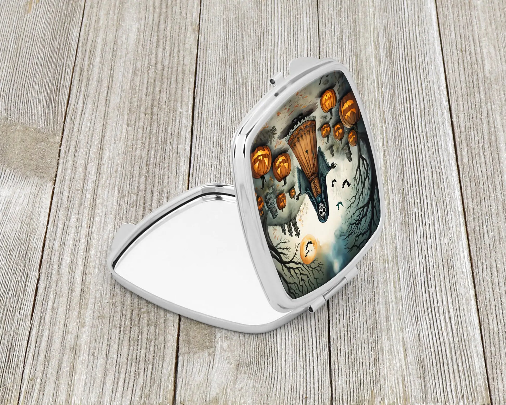 Celebrate Halloween with this Halloween Compact Mirror. Introducing our Square Compact Mirror, a blend of elegance, functionality, and compactness, perfect for on-the-go touch-ups. This Silvertone metal mirror, with dimensions of 2.75 inches x 3 inches x .3 inches, fits effortlessly into your purse, handbag, or pocket, ensuring that you can check your appearance anytime, anywhere. Our compact mirror stands out with its eye-catching artwork on the front, adding a dash of style to this practical accessory. It is more than just a mirror; it's a statement piece that reflects your personality and aesthetic. When opened, this compact reveals two mirrors inside, doubling your perspective for precise touch-ups. The Silvertone metal construction ensures durability while maintaining a lightweight feel, making it an ideal everyday carry item. Whether you're rushing to a meeting, prepping for a dinner date, or just need a quick check on your look, our Square Compact Mirror is your reliable companion. Experience the perfect blend of style and practicality with this must-have accessory.