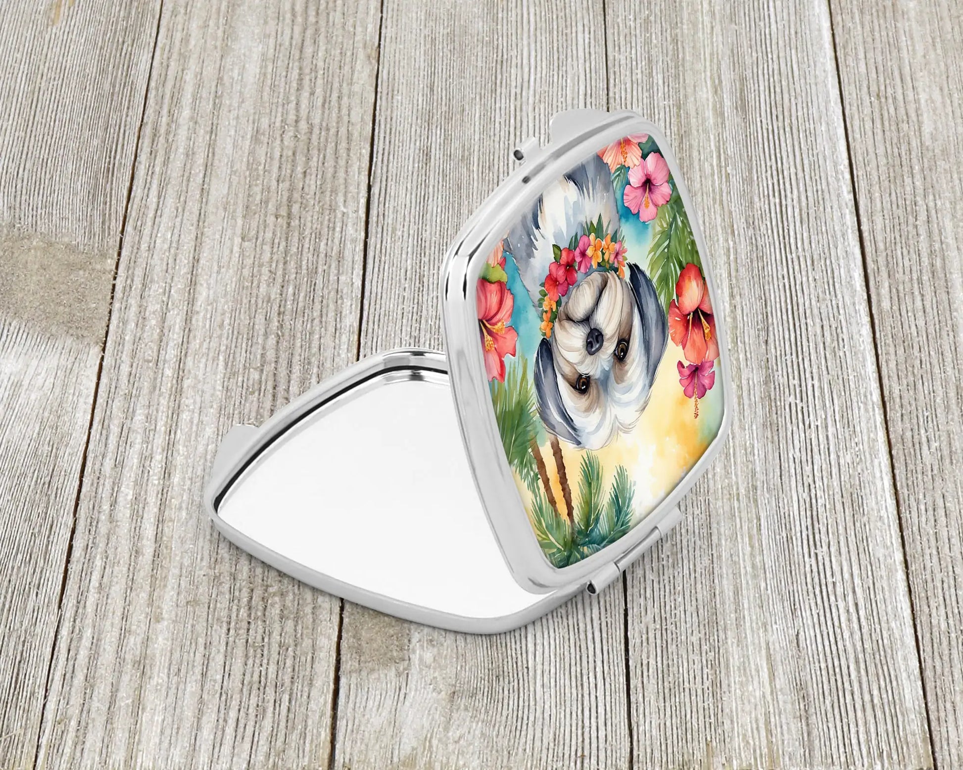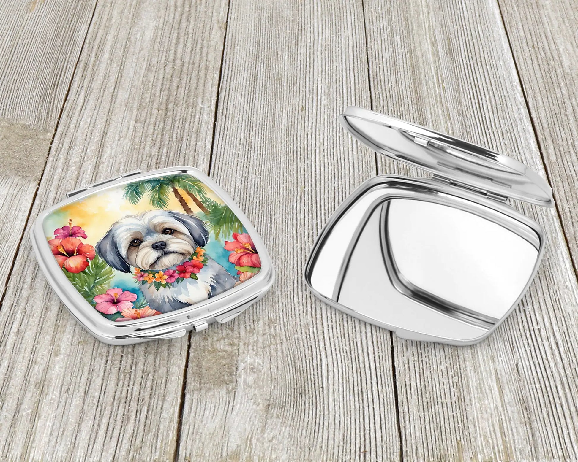 Compact Mirror featuring breed specific Lhasa Apso artwork. Introducing our Square Compact Mirror, a blend of elegance, functionality, and compactness, perfect for on-the-go touch-ups. This Silvertone metal mirror, with dimensions of 2.75 inches x 3 inches x .3 inches, fits effortlessly into your purse, handbag, or pocket, ensuring that you can check your appearance anytime, anywhere. Our compact mirror stands out with its eye-catching artwork on the front, adding a dash of style to this practical accessory. It is more than just a mirror; it's a statement piece that reflects your personality and aesthetic. When opened, this compact reveals two mirrors inside, doubling your perspective for precise touch-ups. The Silvertone metal construction ensures durability while maintaining a lightweight feel, making it an ideal everyday carry item. Whether you're rushing to a meeting, prepping for a dinner date, or just need a quick check on your look, our Square Compact Mirror is your reliable companion. Experience the perfect blend of style and practicality with this must-have accessory.