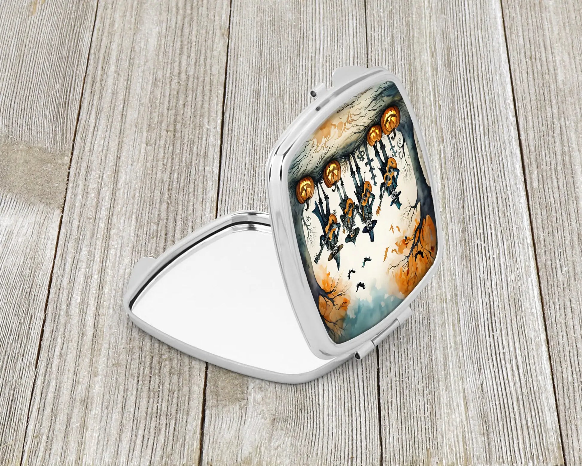 Celebrate Halloween with this Halloween Compact Mirror. Introducing our Square Compact Mirror, a blend of elegance, functionality, and compactness, perfect for on-the-go touch-ups. This Silvertone metal mirror, with dimensions of 2.75 inches x 3 inches x .3 inches, fits effortlessly into your purse, handbag, or pocket, ensuring that you can check your appearance anytime, anywhere. Our compact mirror stands out with its eye-catching artwork on the front, adding a dash of style to this practical accessory. It is more than just a mirror; it's a statement piece that reflects your personality and aesthetic. When opened, this compact reveals two mirrors inside, doubling your perspective for precise touch-ups. The Silvertone metal construction ensures durability while maintaining a lightweight feel, making it an ideal everyday carry item. Whether you're rushing to a meeting, prepping for a dinner date, or just need a quick check on your look, our Square Compact Mirror is your reliable companion. Experience the perfect blend of style and practicality with this must-have accessory.