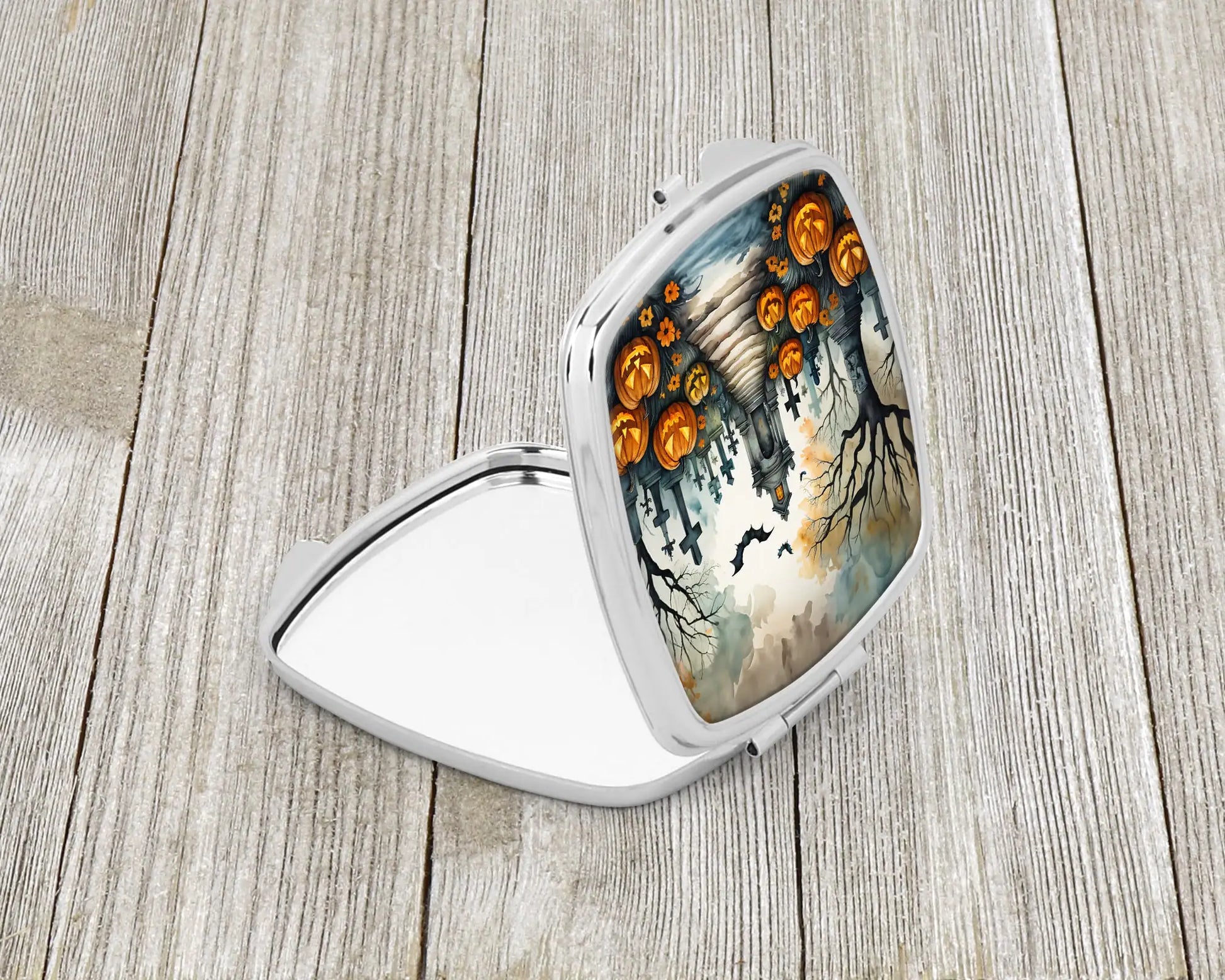 Celebrate Halloween with this Halloween Compact Mirror. Introducing our Square Compact Mirror, a blend of elegance, functionality, and compactness, perfect for on-the-go touch-ups. This Silvertone metal mirror, with dimensions of 2.75 inches x 3 inches x .3 inches, fits effortlessly into your purse, handbag, or pocket, ensuring that you can check your appearance anytime, anywhere. Our compact mirror stands out with its eye-catching artwork on the front, adding a dash of style to this practical accessory. It is more than just a mirror; it's a statement piece that reflects your personality and aesthetic. When opened, this compact reveals two mirrors inside, doubling your perspective for precise touch-ups. The Silvertone metal construction ensures durability while maintaining a lightweight feel, making it an ideal everyday carry item. Whether you're rushing to a meeting, prepping for a dinner date, or just need a quick check on your look, our Square Compact Mirror is your reliable companion. Experience the perfect blend of style and practicality with this must-have accessory.