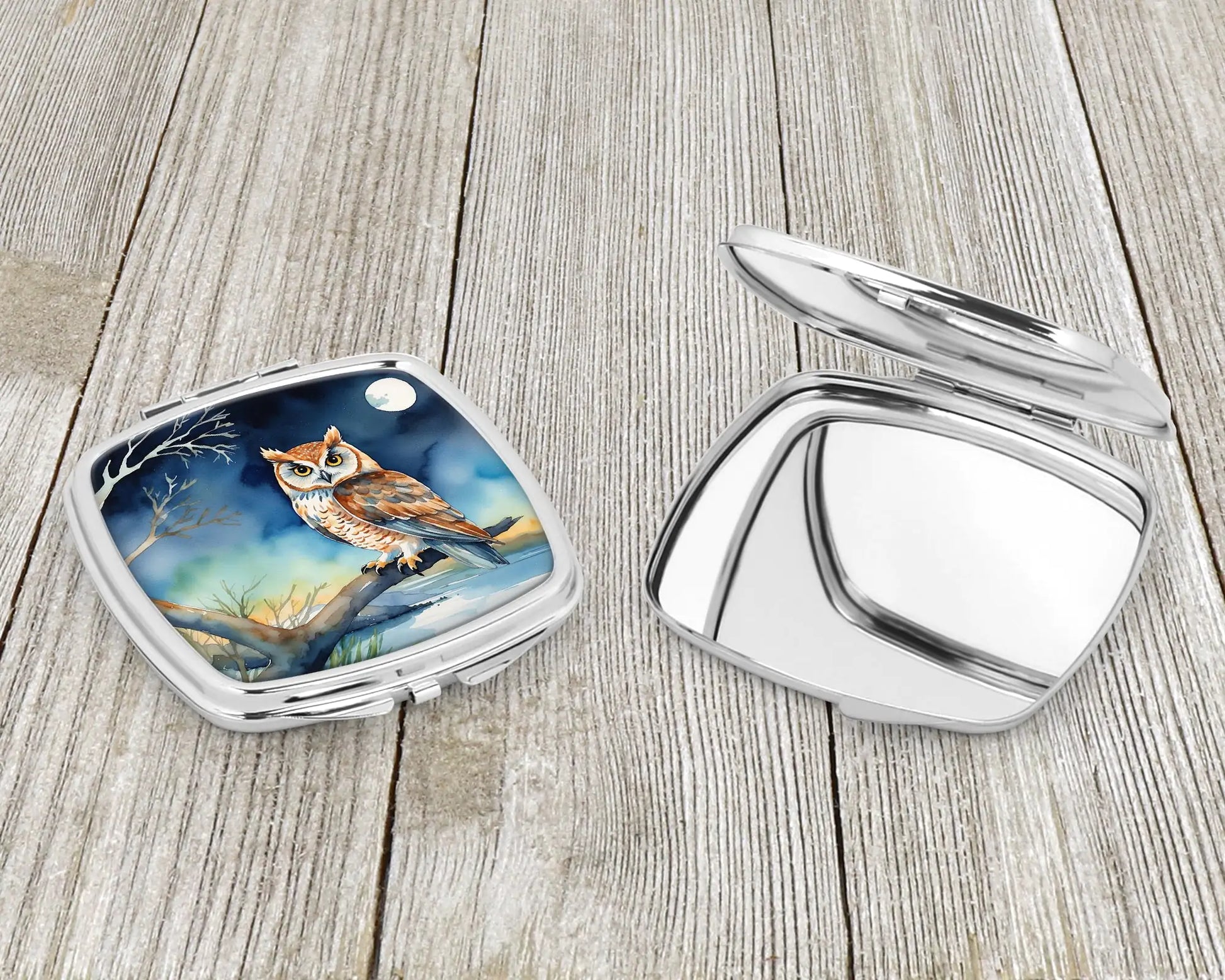 Compact Mirror featuring breed specific Owl artwork. Introducing our Square Compact Mirror, a blend of elegance, functionality, and compactness, perfect for on-the-go touch-ups. This Silvertone metal mirror, with dimensions of 2.75 inches x 3 inches x .3 inches, fits effortlessly into your purse, handbag, or pocket, ensuring that you can check your appearance anytime, anywhere. Our compact mirror stands out with its eye-catching artwork on the front, adding a dash of style to this practical accessory. It is more than just a mirror; it's a statement piece that reflects your personality and aesthetic. When opened, this compact reveals two mirrors inside, doubling your perspective for precise touch-ups. The Silvertone metal construction ensures durability while maintaining a lightweight feel, making it an ideal everyday carry item. Whether you're rushing to a meeting, prepping for a dinner date, or just need a quick check on your look, our Square Compact Mirror is your reliable companion. Experience the perfect blend of style and practicality with this must-have accessory.