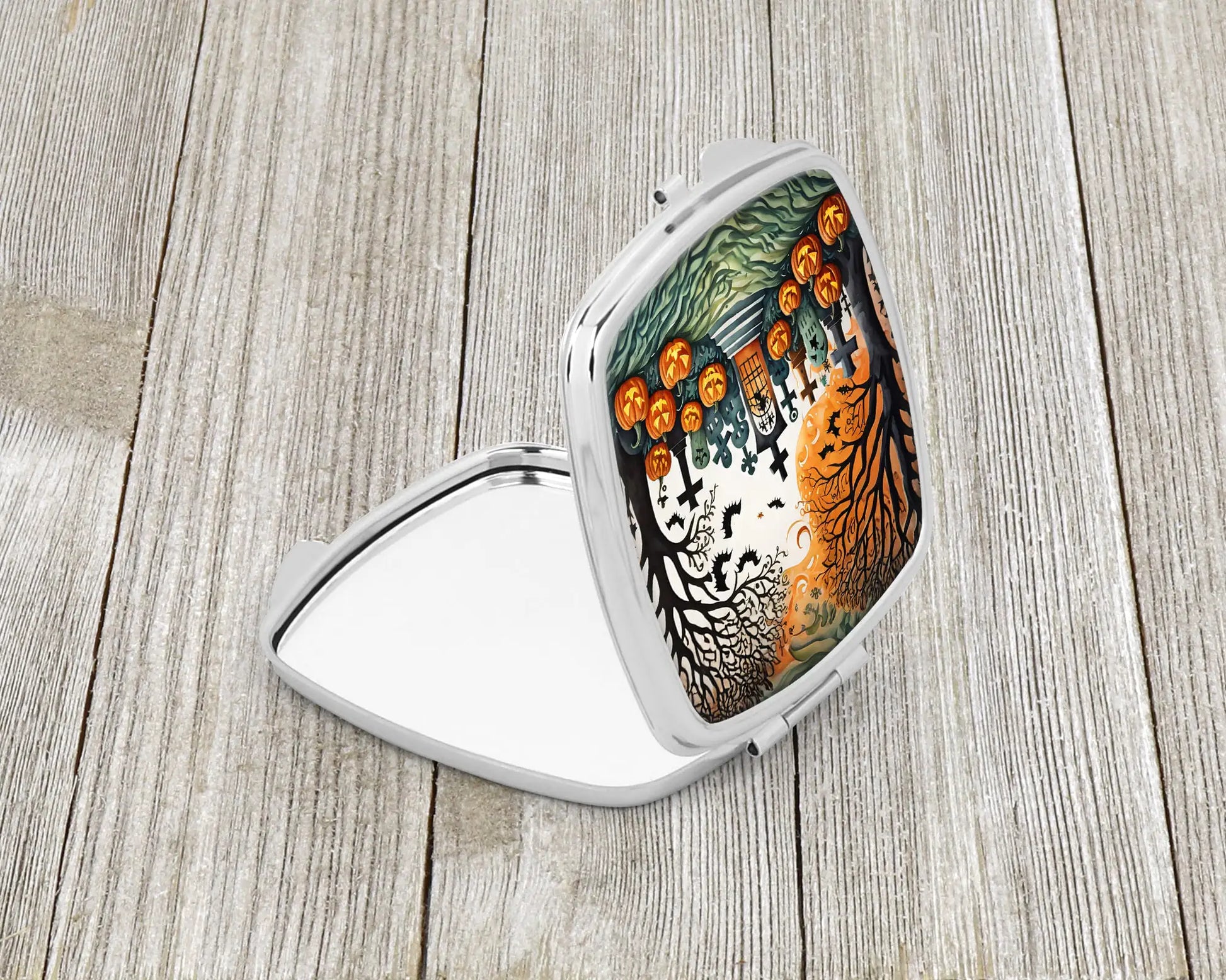 Celebrate Halloween with this Halloween Compact Mirror. Introducing our Square Compact Mirror, a blend of elegance, functionality, and compactness, perfect for on-the-go touch-ups. This Silvertone metal mirror, with dimensions of 2.75 inches x 3 inches x .3 inches, fits effortlessly into your purse, handbag, or pocket, ensuring that you can check your appearance anytime, anywhere. Our compact mirror stands out with its eye-catching artwork on the front, adding a dash of style to this practical accessory. It is more than just a mirror; it's a statement piece that reflects your personality and aesthetic. When opened, this compact reveals two mirrors inside, doubling your perspective for precise touch-ups. The Silvertone metal construction ensures durability while maintaining a lightweight feel, making it an ideal everyday carry item. Whether you're rushing to a meeting, prepping for a dinner date, or just need a quick check on your look, our Square Compact Mirror is your reliable companion. Experience the perfect blend of style and practicality with this must-have accessory.