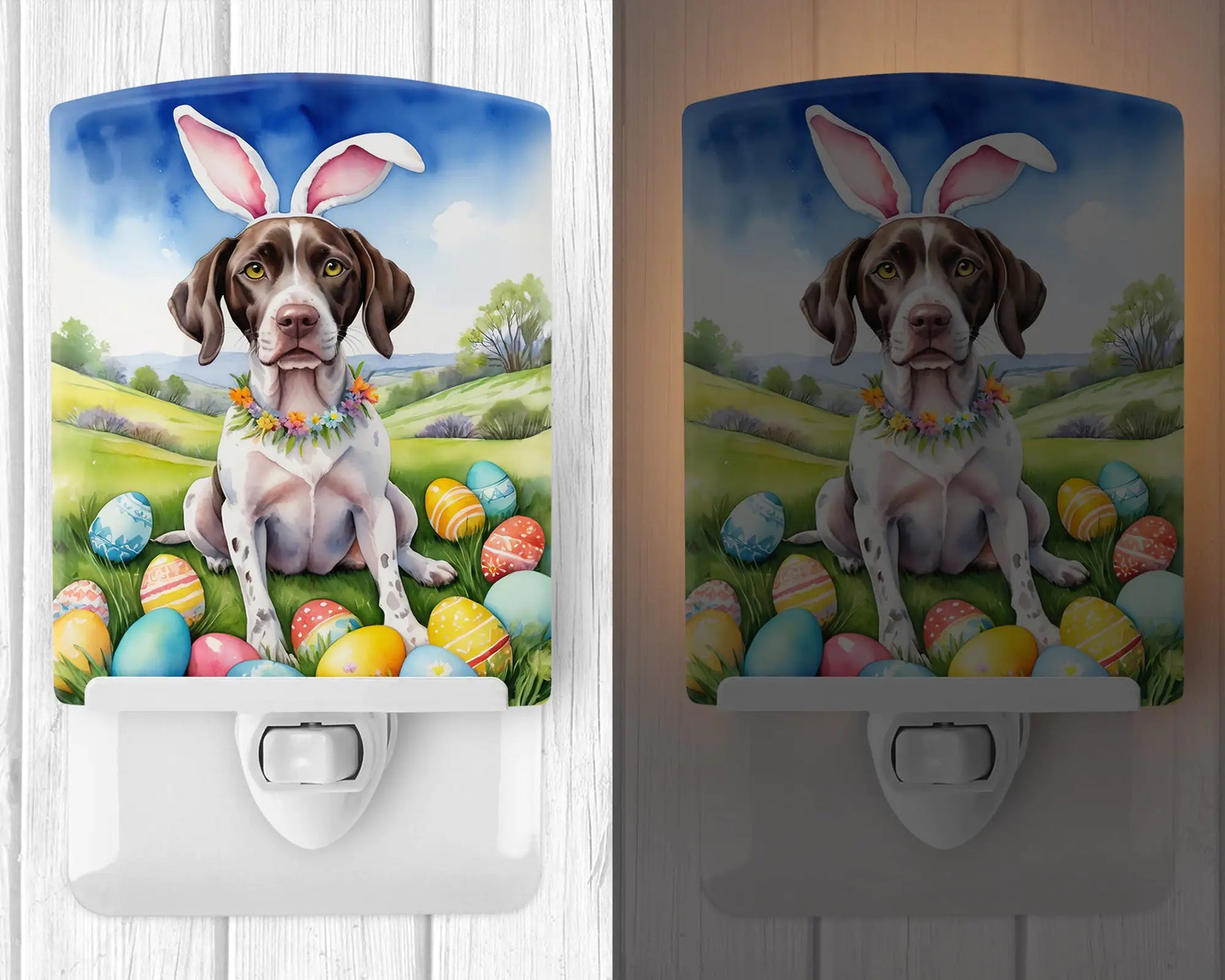 Ceramic Night Light featuring breed specific Pointer artwork. Celebrate Easter with this Easter Night Light. Introduce a splash of artistic flair and subtle illumination to your space with the Decorative Ceramic Night Light from Caroline's Treasures. Perfect for any room, this night light seamlessly blends functionality with an aesthetic appeal, offering a stylish solution to brighten up dark corners of your home or office. Boasting a six-inch high by four-inch wide ceramic tile at the front, it showcases vivid, full-color artwork from distinguished artists, transforming a simple utility into a vibrant art piece. The artwork is securely encased in a robust metal holder, ensuring durability and longevity. Two screws are provided to firmly affix the tile into the holder. The holder extends three inches deep, housing an included bulb that emits a soft, welcoming glow. This product meets all safety standards, as evidenced by its UL approval. Proudly made in the United States from imported components, this Decorative Ceramic Night Light is not just a functional device; it's a statement piece that enhances the ambiance of your surroundings.