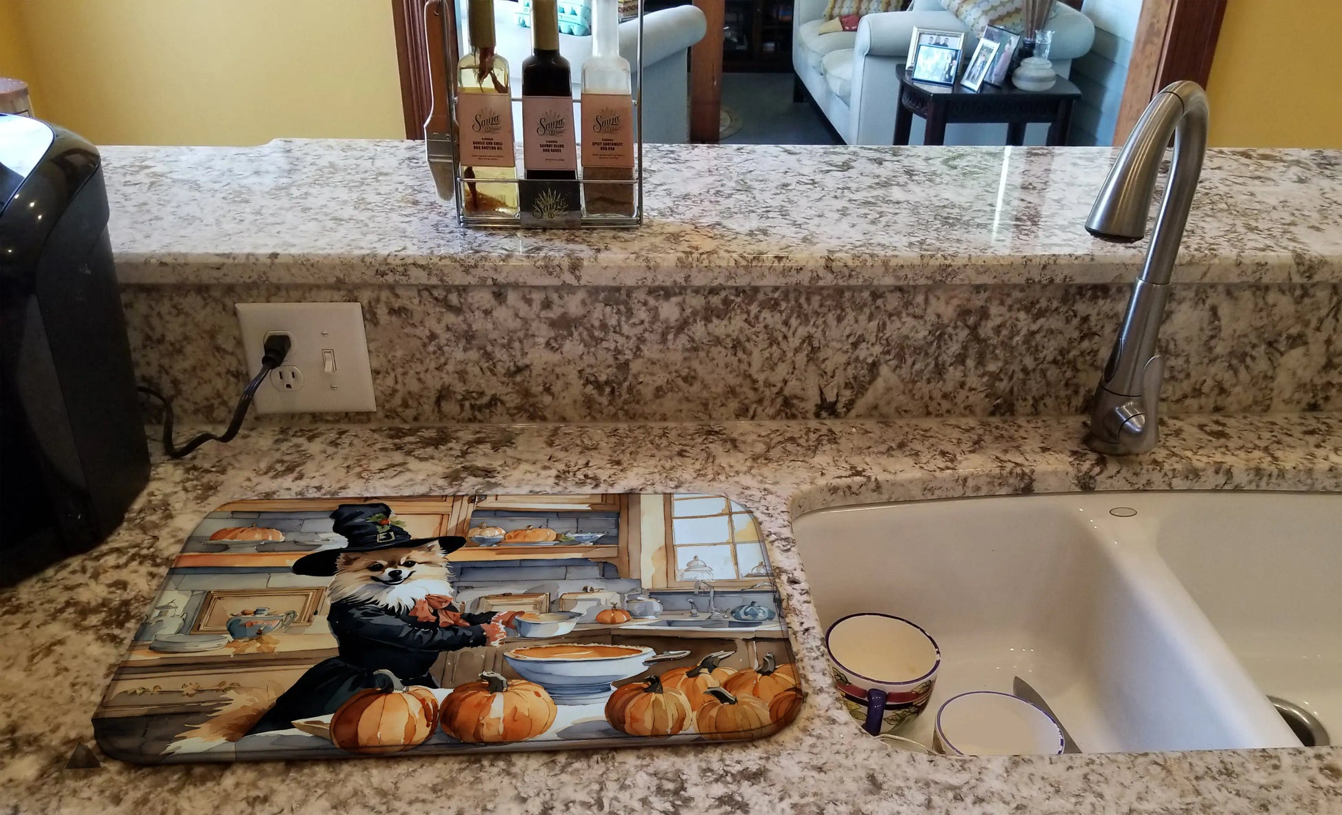 Dish Drying Mat featuring breed specific Pomeranian artwork. Celebrate Halloween with this Halloween Dish Drying Mat. Say goodbye to messy countertops and soggy dish towels with our innovative dish drying mat. Our high-quality dish drying pad is designed to keep your countertops dry while offering a stylish and efficient solution. Whether you're air drying dishes, glasses, stemware, silverware, pots, pans, bottles, or even fruits and vegetables, our dish mat is the perfect choice. The 14 inches x 22 inches size fits most counters and dish drying racks, and the non-slip design ensures stability. Made with water-absorbent polyester and a polyurethane foam insert, our dish drying mat is not only functional but also durable. It's machine washable and printed in the USA for long-lasting use. The beautiful artwork adds flair to your kitchen decor, making it a perfect housewarming gift or present for any occasion. Upgrade your kitchen experience with our absorbent and versatile dish drying mat.