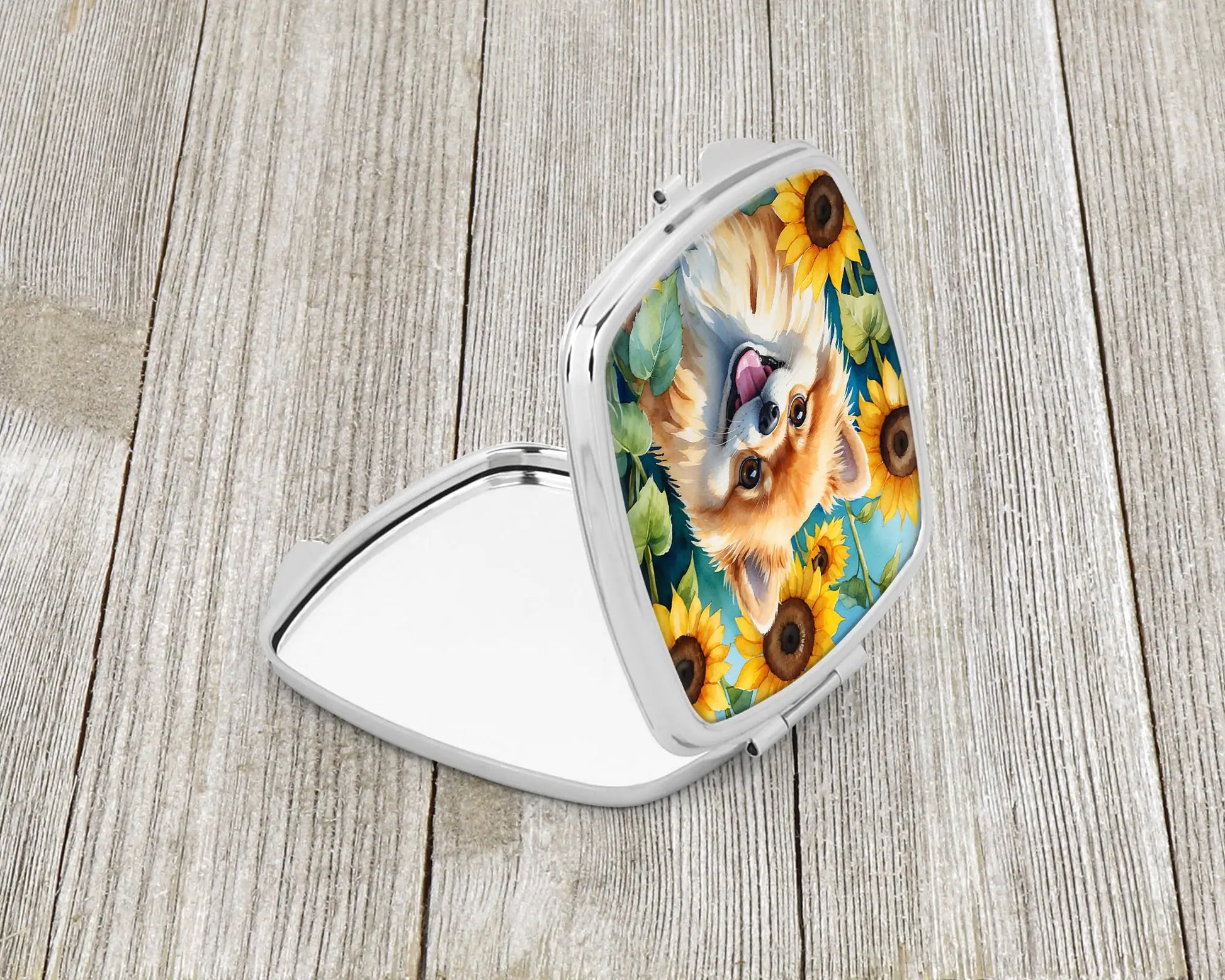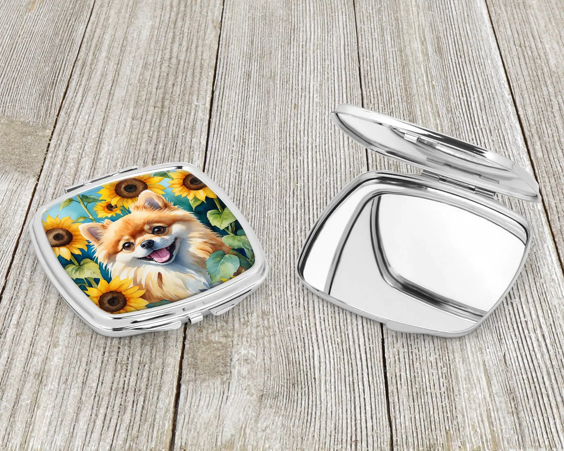 Compact Mirror featuring breed specific Pomeranian artwork. Introducing our Square Compact Mirror, a blend of elegance, functionality, and compactness, perfect for on-the-go touch-ups. This Silvertone metal mirror, with dimensions of 2.75 inches x 3 inches x .3 inches, fits effortlessly into your purse, handbag, or pocket, ensuring that you can check your appearance anytime, anywhere. Our compact mirror stands out with its eye-catching artwork on the front, adding a dash of style to this practical accessory. It is more than just a mirror; it's a statement piece that reflects your personality and aesthetic. When opened, this compact reveals two mirrors inside, doubling your perspective for precise touch-ups. The Silvertone metal construction ensures durability while maintaining a lightweight feel, making it an ideal everyday carry item. Whether you're rushing to a meeting, prepping for a dinner date, or just need a quick check on your look, our Square Compact Mirror is your reliable companion. Experience the perfect blend of style and practicality with this must-have accessory.