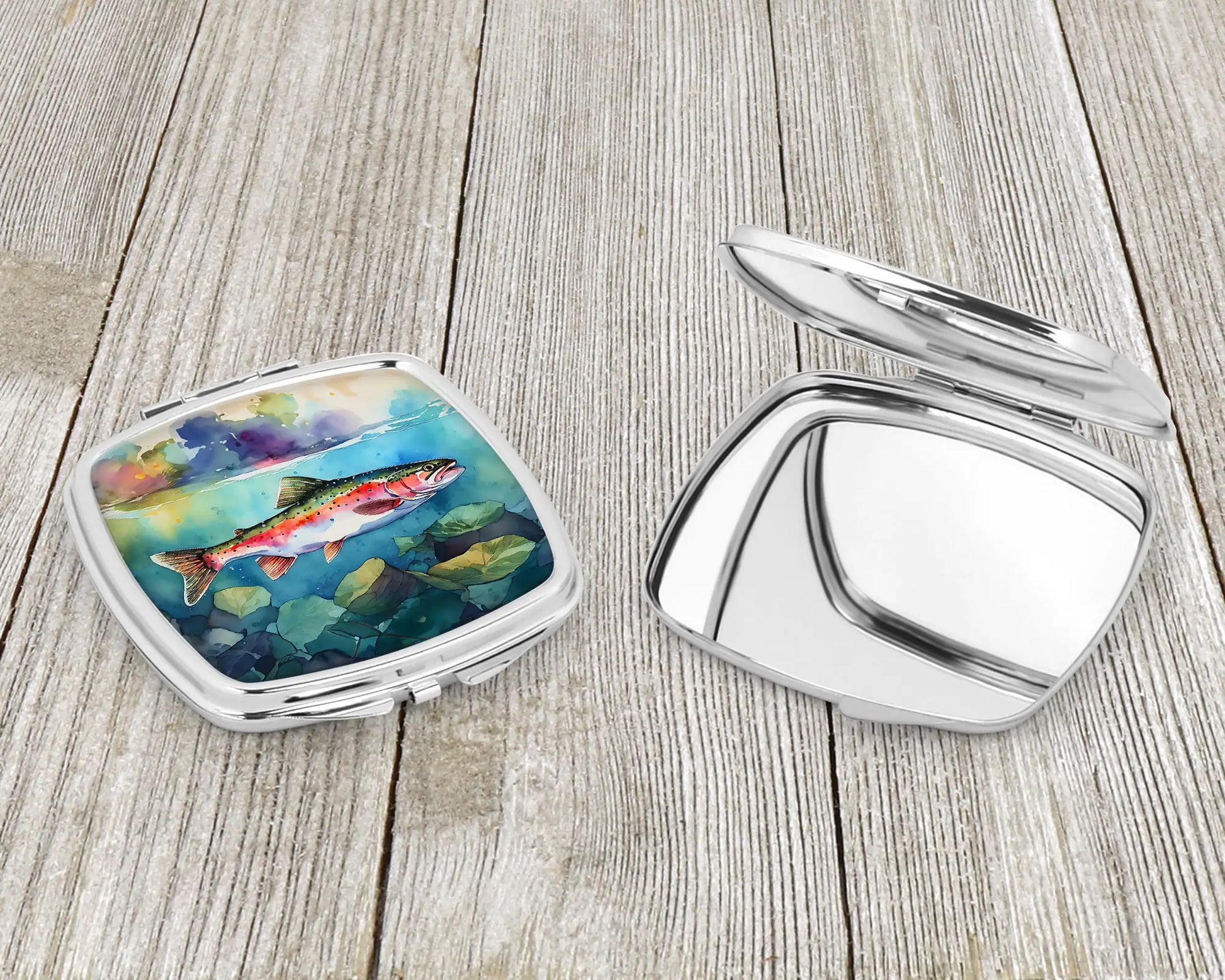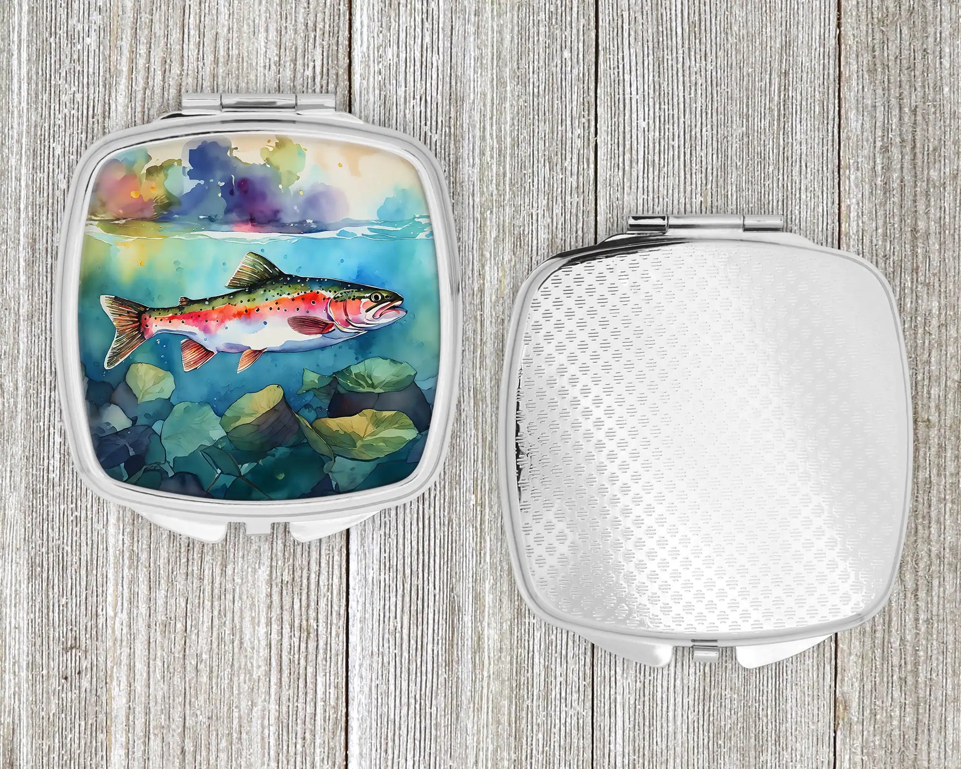 Compact Mirror featuring breed specific Rainbow Trout artwork. Introducing our Square Compact Mirror, a blend of elegance, functionality, and compactness, perfect for on-the-go touch-ups. This Silvertone metal mirror, with dimensions of 2.75 inches x 3 inches x .3 inches, fits effortlessly into your purse, handbag, or pocket, ensuring that you can check your appearance anytime, anywhere. Our compact mirror stands out with its eye-catching artwork on the front, adding a dash of style to this practical accessory. It is more than just a mirror; it's a statement piece that reflects your personality and aesthetic. When opened, this compact reveals two mirrors inside, doubling your perspective for precise touch-ups. The Silvertone metal construction ensures durability while maintaining a lightweight feel, making it an ideal everyday carry item. Whether you're rushing to a meeting, prepping for a dinner date, or just need a quick check on your look, our Square Compact Mirror is your reliable companion. Experience the perfect blend of style and practicality with this must-have accessory.