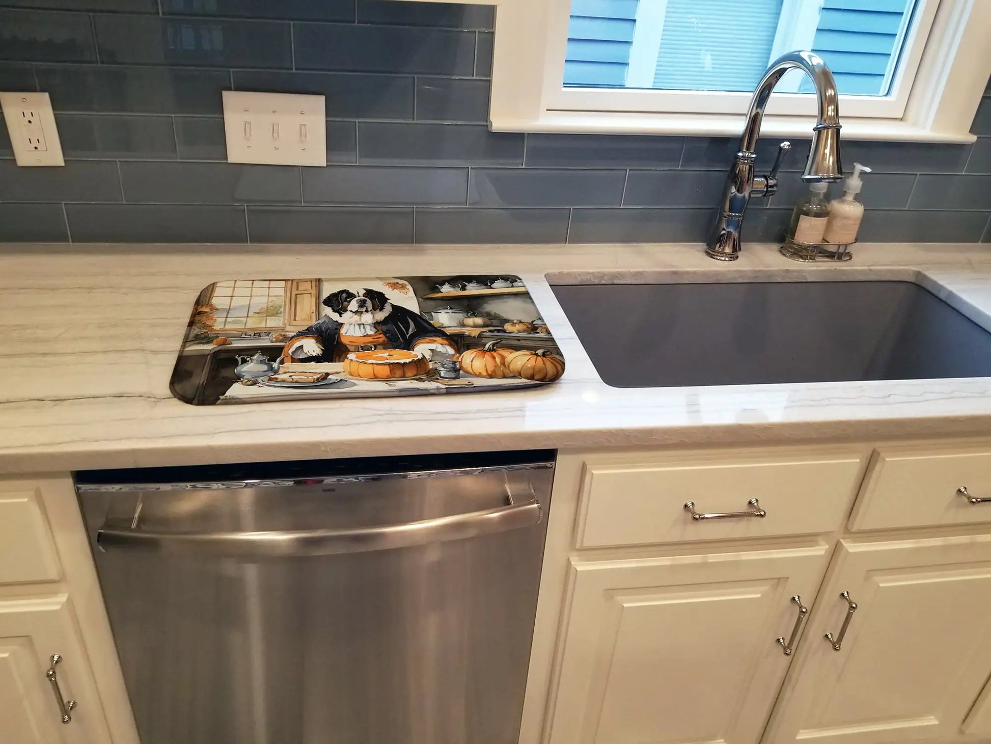 Dish Drying Mat featuring breed specific Saint Bernard artwork. Celebrate Halloween with this Halloween Dish Drying Mat. Say goodbye to messy countertops and soggy dish towels with our innovative dish drying mat. Our high-quality dish drying pad is designed to keep your countertops dry while offering a stylish and efficient solution. Whether you're air drying dishes, glasses, stemware, silverware, pots, pans, bottles, or even fruits and vegetables, our dish mat is the perfect choice. The 14 inches x 22 inches size fits most counters and dish drying racks, and the non-slip design ensures stability. Made with water-absorbent polyester and a polyurethane foam insert, our dish drying mat is not only functional but also durable. It's machine washable and printed in the USA for long-lasting use. The beautiful artwork adds flair to your kitchen decor, making it a perfect housewarming gift or present for any occasion. Upgrade your kitchen experience with our absorbent and versatile dish drying mat.